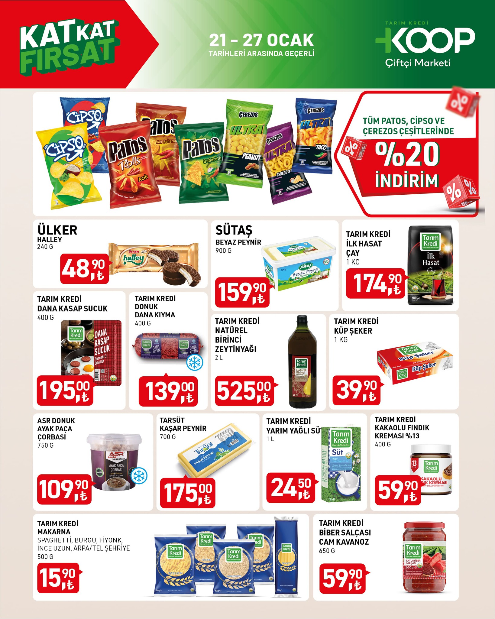 Ocak ayının son haftasına özel Tarım Kredi Kooperatifi, aktüel ürünler kataloğunu müşterilerinin beğenisine sundu. Market raflarında geniş bir ürün yelpazesi avantajlı fiyatlarla satışa sunulurken, pek çok kategoriye ait ürünler ekonomik alışveriş yapmak isteyenlerin dikkatini çekiyor. İşte 22-27 Ocak fiyat listesi...