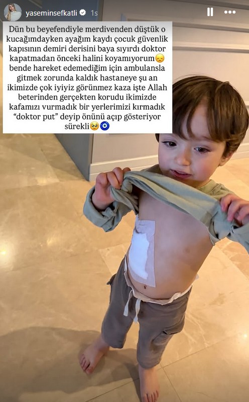 "Dün bu beyefendiyle merdivenden düştük, o kucağımdayken ayağım kaydı. Çocuk güvenlik kapısının demiri derisini bayağı sıyırdı. Ben de hareket edemediğim için ambulansla gitmek zorunda kaldık hastaneye. Şu an ikimiz de çok iyiyiz. Görünmez kaza işte, Allah beterinden gerçekten korudu. İkimiz de kafamızı vurmadık, bir yerlerimizi kırmadık."
