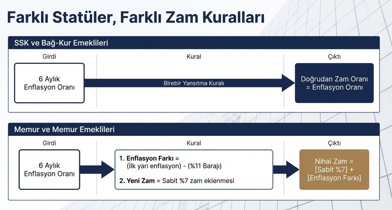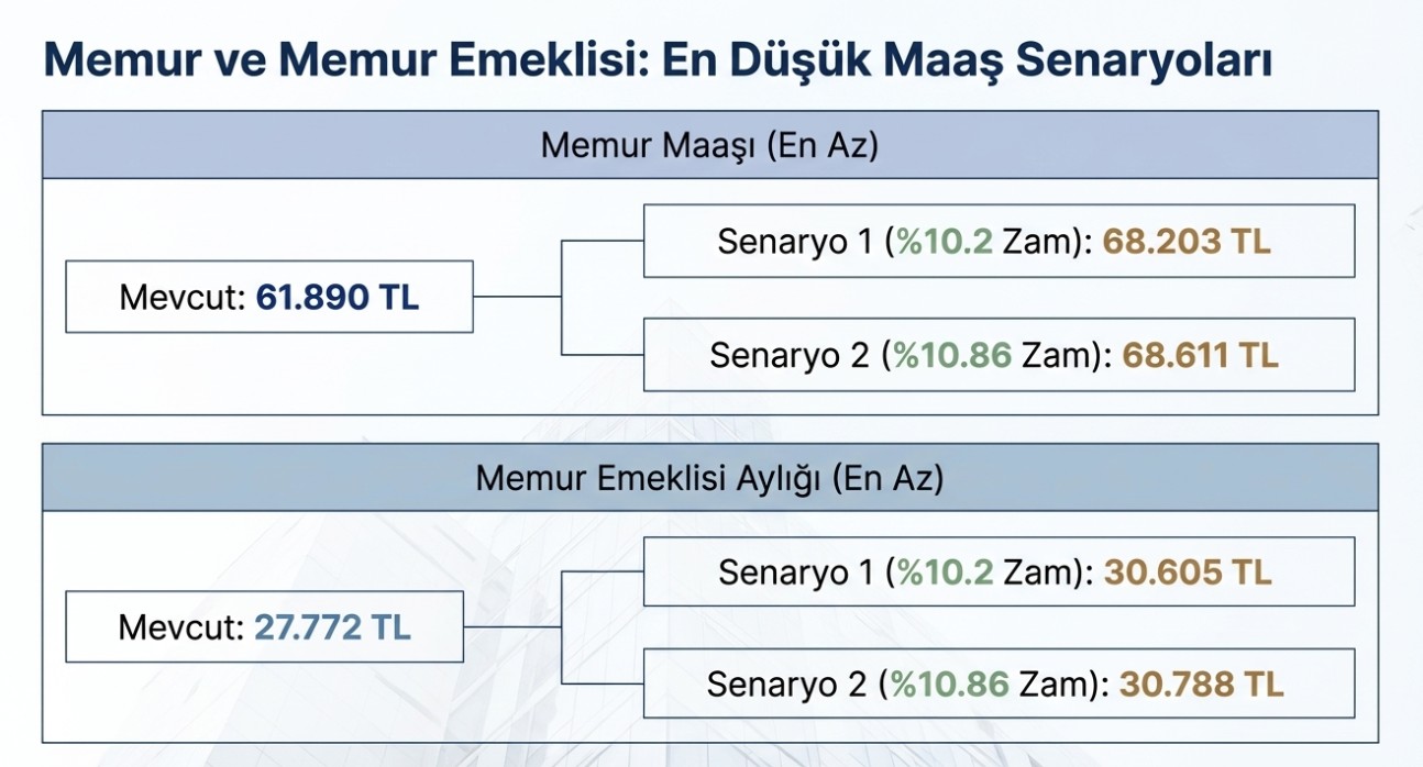 Memur ve memur emeklileri açısından ise yüzde 7'lik toplu sözleşme zammına ek olarak yüzde 2.99 enflasyon farkı oluşuyor. Böylece toplam artışın yüzde 10.2 seviyesine çıkabileceği hesaplanıyor.