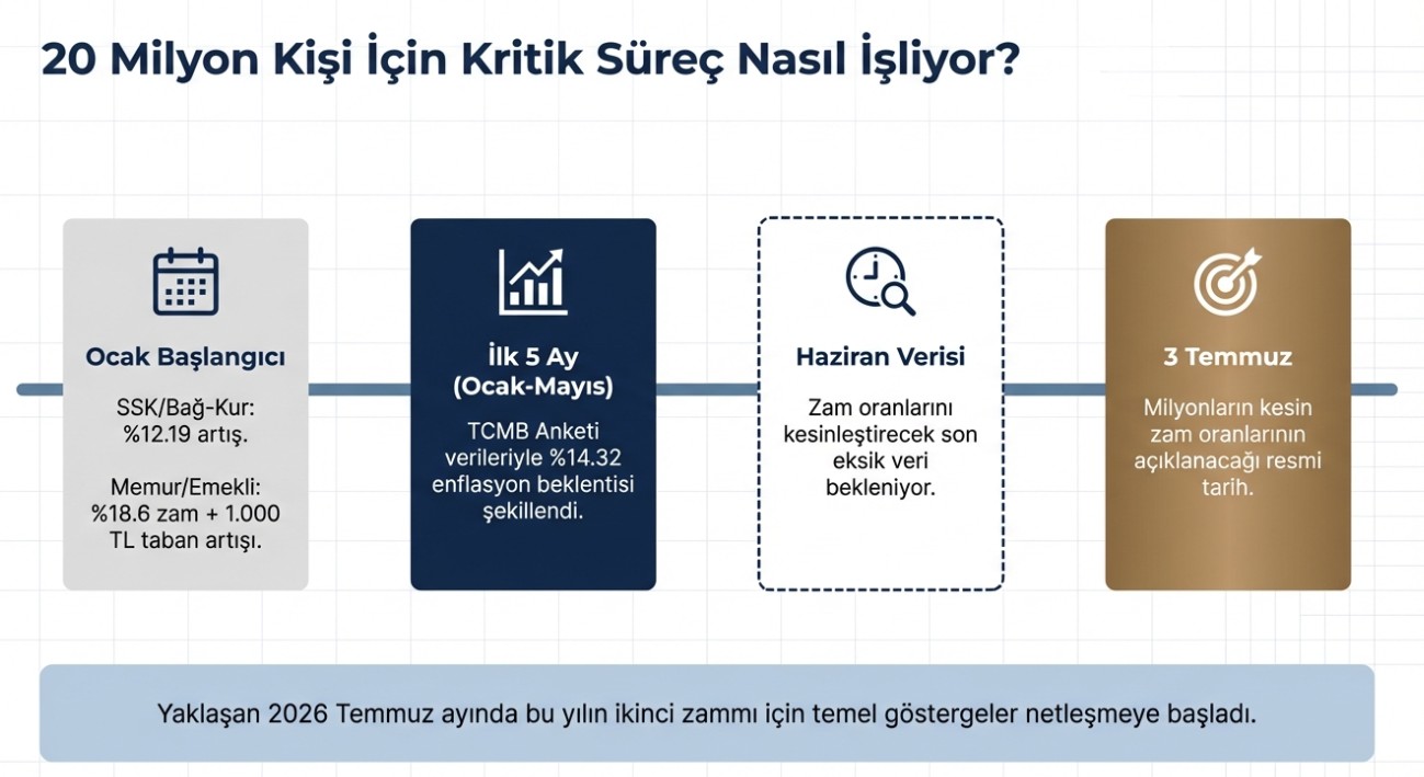 Milyonlarca memur ve emekli için temmuz zammına ilişkin tablo netleşmeye başladı. Türkiye Cumhuriyet Merkez Bankası'nın Piyasa Katılımcıları Anketi'nden çıkan veriler, yılın ilk yarısına ilişkin güçlü ipuçları verirken, nihai oran için haziran enflasyonu belirleyici olacak.