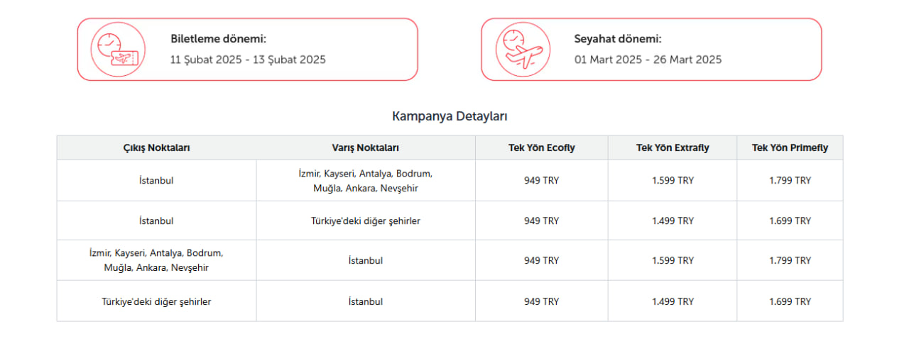 Kampanyalı biletler, 1 Mart–26 Mart 2025 tarihleri arasında geçerli olacak. EcoFly ücret sınıfında yurt içi uçuşlar için bilet fiyatları 949 TL'den başlarken, ExtraFly ve PrimeFly paketlerinde fiyatlar, uçuş güzergahına göre değişiklik gösterecek.