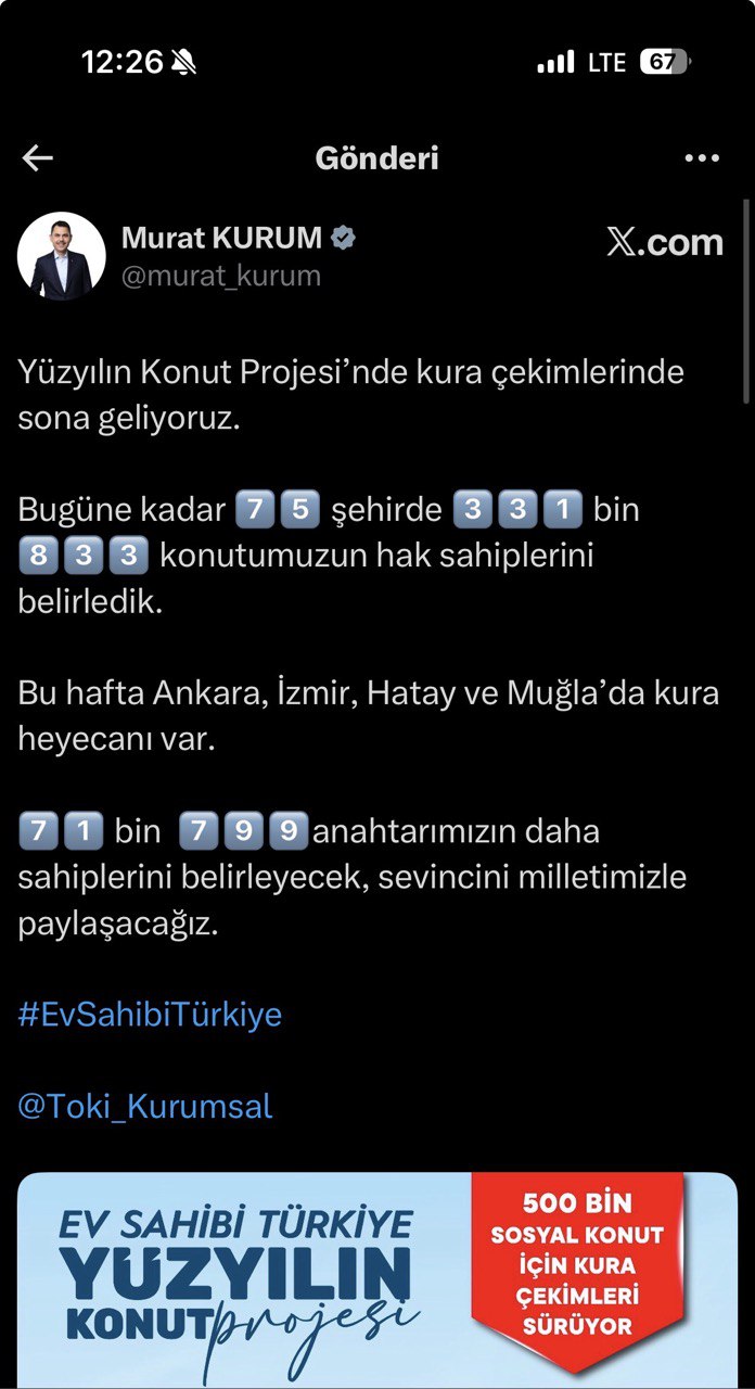 - Adıyaman'dan Van'a, Erzurum'dan Antalya'ya, Trabzon'dan Konya'ya kadar Türkiye'nin dört bir yanında düzenlenen kura çekimleriyle yüz binlerce vatandaşın konut sahibi olma hayali somut bir aşamaya taşındı.