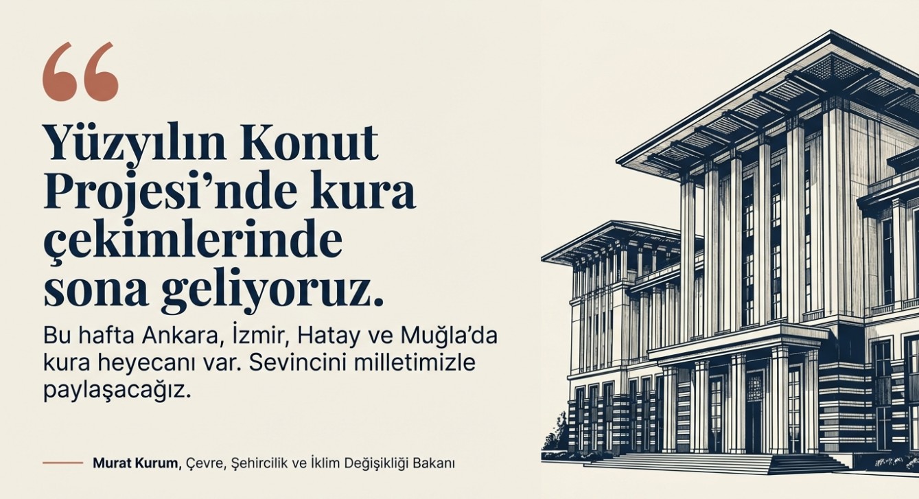 Yüzyılın Konut Projesi'nde kura süreci son aşamaya geldi. Çevre, Şehircilik ve İklim Değişikliği Bakanlığı koordinasyonunda yürütülen ve TOKİ tarafından hayata geçirilen proje kapsamında, 2-8 Mart 2026 tarihleri arasında Ankara, İzmir, Hatay ve Muğla'da toplam 71 bin 799 konutun hak sahipleri noter huzurunda belirlenecek.