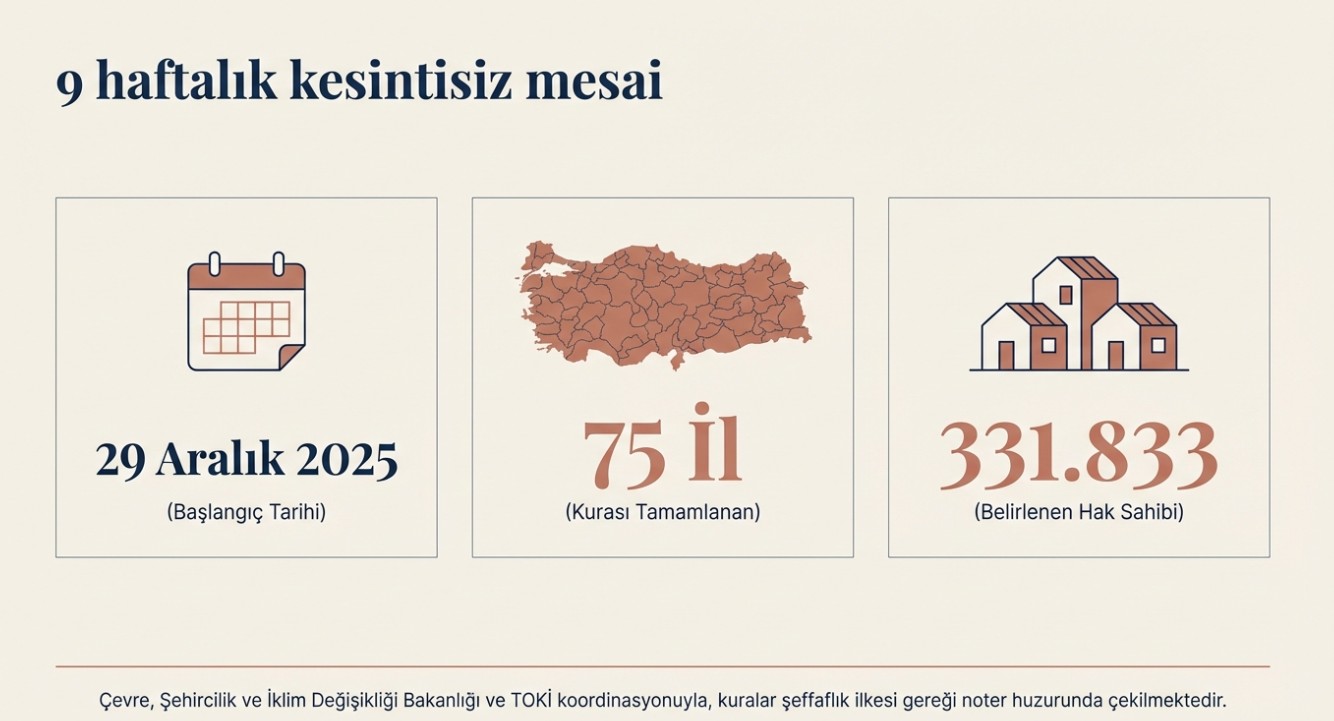 Bu kapsamda; Doğu ve Güneydoğu Anadolu'dan Karadeniz'e, İç Anadolu'dan Ege ve Marmara'ya kadar geniş bir coğrafyada kura organizasyonları gerçekleştirildi. Noter huzurunda yapılan çekilişlerle toplam 331 bin 833 sosyal konutun hak sahipleri belirlendi.