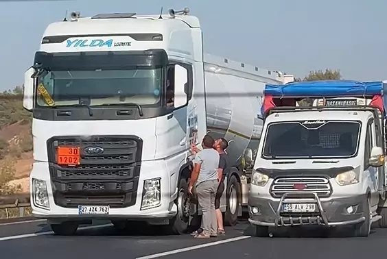 Seyir halindeki TIR ile kamyonet sürücüleri, yol verme nedeniyle tartıştı. Akan trafikte kamyonetteki sürücü ile yanındaki kişi araçtan inip, TIR'ın sürücüsüne tepki gösterdi.