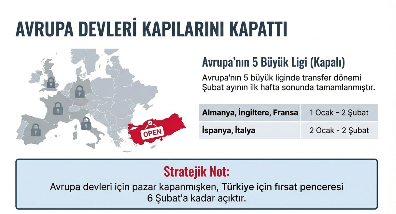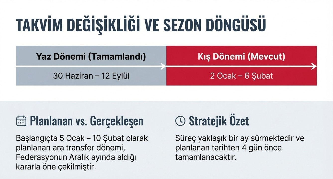 Türkiye Futbol Federasyonu tarafından açıklanan takvime göre ara transfer dönemi, 6 Şubat 2026 günü saat 23.59 itibarıyla sona erecek. Bu saatten sonra kulüpler, serbest oyuncu statüsü dışında yeni futbolcuları kadrolarına katamayacak.