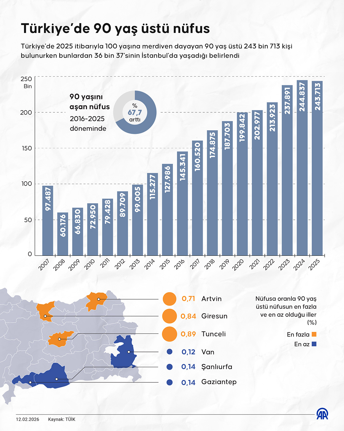 Türkiye İstatistik Kurumu verilerine göre ülke nüfusu 2025 yılında 86 milyon 92 bin 168 kişiye ulaştı. Aynı dönemde 90 yaşını aşarak 100 yaşına yaklaşan kişi sayısı 243 bin 713 olarak kaydedildi. Türkiye'de ileri yaş grubunun toplam nüfus içindeki payı 10 yılda yüzde 67,7 oranında arttı.