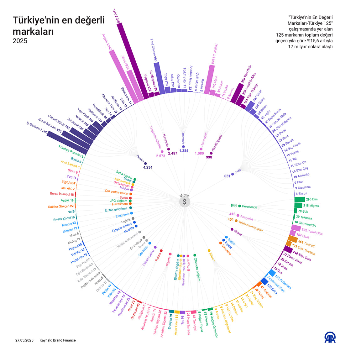 Uluslararası marka değerlendirme kuruluşu Brand Finance, 2025 yılı için "Türkiye'nin En Değerli Markaları – Türkiye 125" araştırmasını tamamladı. 2007'den bu yana yayımlanan liste, sermaye piyasasına dahil markalardaki artışla birlikte 100'den 125 markaya yükseldi. Araştırmaya göre Türk Hava Yolları (THY), marka değeriyle üst üste bir kez daha Türkiye'nin lideri oldu.