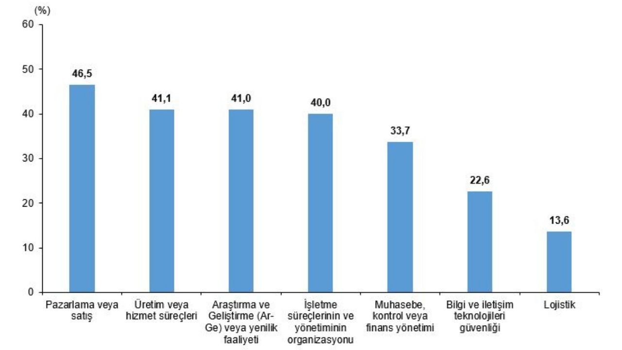 Yapay zekadan faydalanan işletmelerin en çok kullandığı alan pazarlama ve satış oldu. 2025'te girişimlerin yüzde 46,5'i yapay zekayı bu amaçla tercih etti. Onu yüzde 41,1 ile üretim ve hizmet süreçleri, yüzde 41 ile Ar-Ge ve inovasyon faaliyetleri, yüzde 40 ile işletme yönetimi ve organizasyonu izledi. Finans yönetimi, siber güvenlik ve lojistikte ise daha düşük oranlarda kullanım tespit edildi.