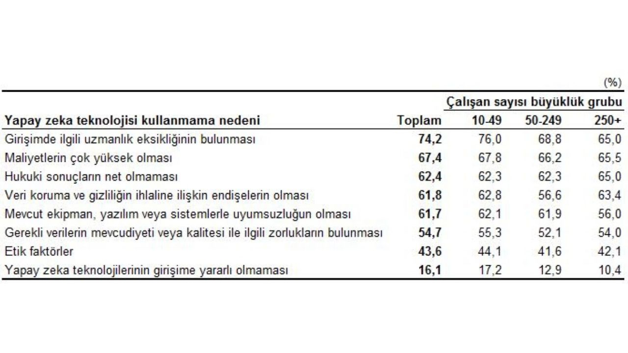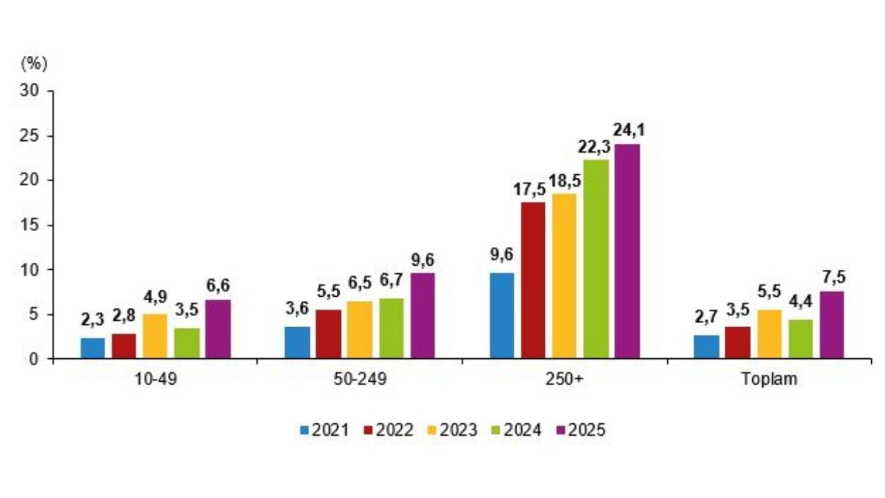 Türkiye İstatistik Kurumu'nun 2025 verilerine göre, işletmelerin yapay zekaya ilgisi son yıllarda hızla artış gösterdi. 2021 yılında yalnızca yüzde 2,7 olan yapay zeka kullanan girişim oranı, 2025'te yüzde 7,5'e yükseldi.