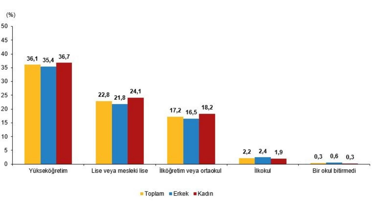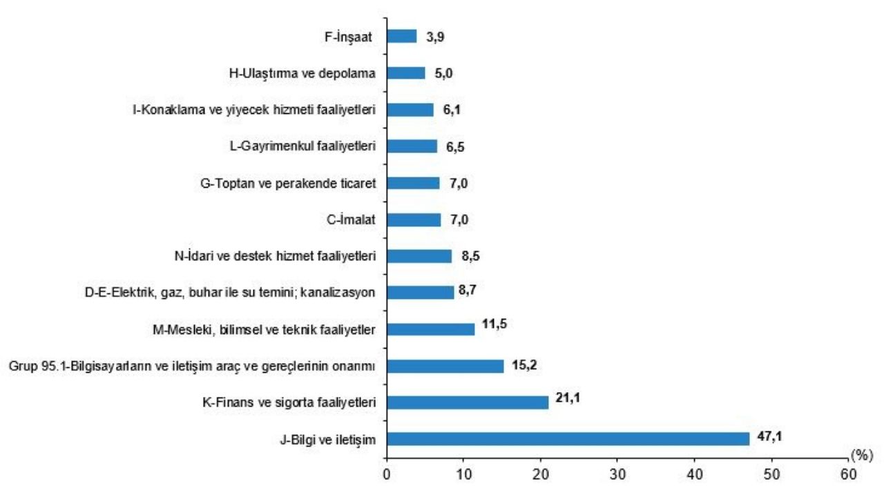 Sektörler incelendiğinde, yapay zekanın en yoğun şekilde yüzde 47,1 oranıyla bilgi ve iletişim alanında kullanıldığı görüldü. Finans ve sigorta sektöründe bu oran yüzde 21,1 iken, bilgisayar ve iletişim ekipmanlarının onarımında yüzde 15,2 olarak kaydedildi. Veriler, özellikle teknoloji ve finans odaklı sektörlerin yapay zekayı iş süreçlerine hızla entegre ettiğini gösteriyor.