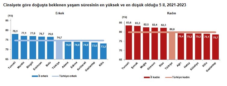 Türkiye'nin en kalabalık şehirleri olan İstanbul ve Ankara, ortalama yaşam süresi bakımından dikkat çekiyor. En fazla nüfusun bulunduğu İstanbul'da doğuşta beklenen yaşam süresi 78,6 yıl, Ankara'da ise 79,2 yıl oldu. Bu oran, İstanbul'da erkeklerde 75,8 yıl, kadınlarda 81,3 yıl iken, Ankara'da ise erkeklerde 76,5 yıl, kadınlarda 81,8 yıl oldu.