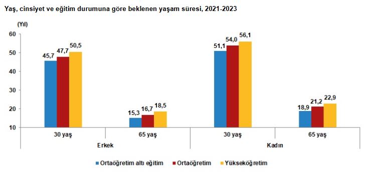 TÜİK açıklamasında, eğitim seviyesi yükseldikçe beklenen yaşam süresinin artığı vurgulanıyor. Yaşam süresi düşük eğitim seviyesine sahip kişilerde daha kısa olurken, yüksek eğitim seviyesine sahip kişilerde ise yaşam süresinin arttığı belirtiliyor.