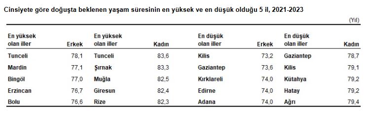 İl bazında yapılan incelemelerde, Türkiye'nin en uzun yaşam süresine sahip şehirleri belirlendi. Türkiye genelinde en uzun yaşam süresine sahip il 80,8 yıl ile Tunceli oldu. Tunceli'yi 79,7 yıl ile Şırnak ve Mardin takip etti. En düşük yaşam süresine sahip iller ise 76,1 yıl ile Kilis, 76,2 yıl ile Gaziantep ve 76,8 yıl ile Adana olarak belirlendi.
