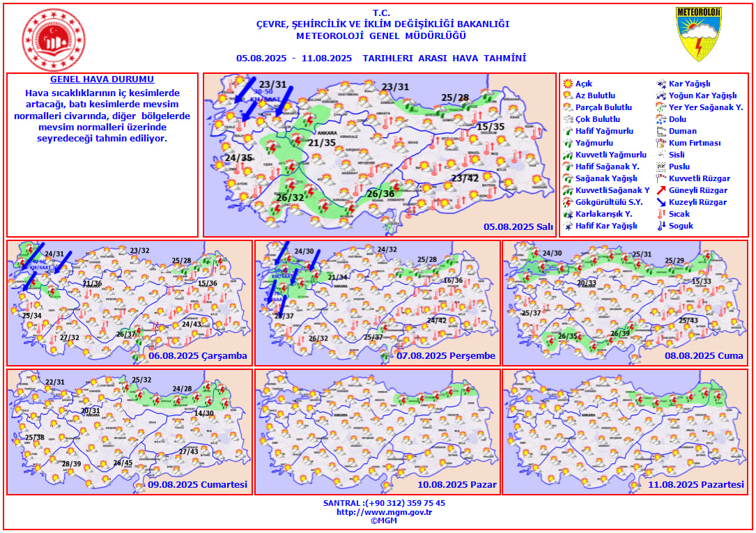 Meteoroloji Genel Müdürlüğü Hava Tahmin Uzmanı Cengiz Çelik'in açıklamasına göre, hava sıcaklıkları bu hafta genel olarak mevsim normallerinde seyredecek. Batı ve iç bölgelerde sıcaklıklar yer yer 1-2 derece artarken, doğu bölgelerinde mevsim normallerinin 3-4 derece üzerine çıkması bekleniyor.