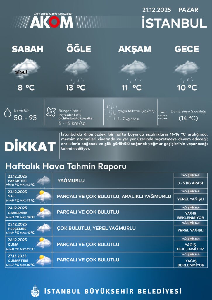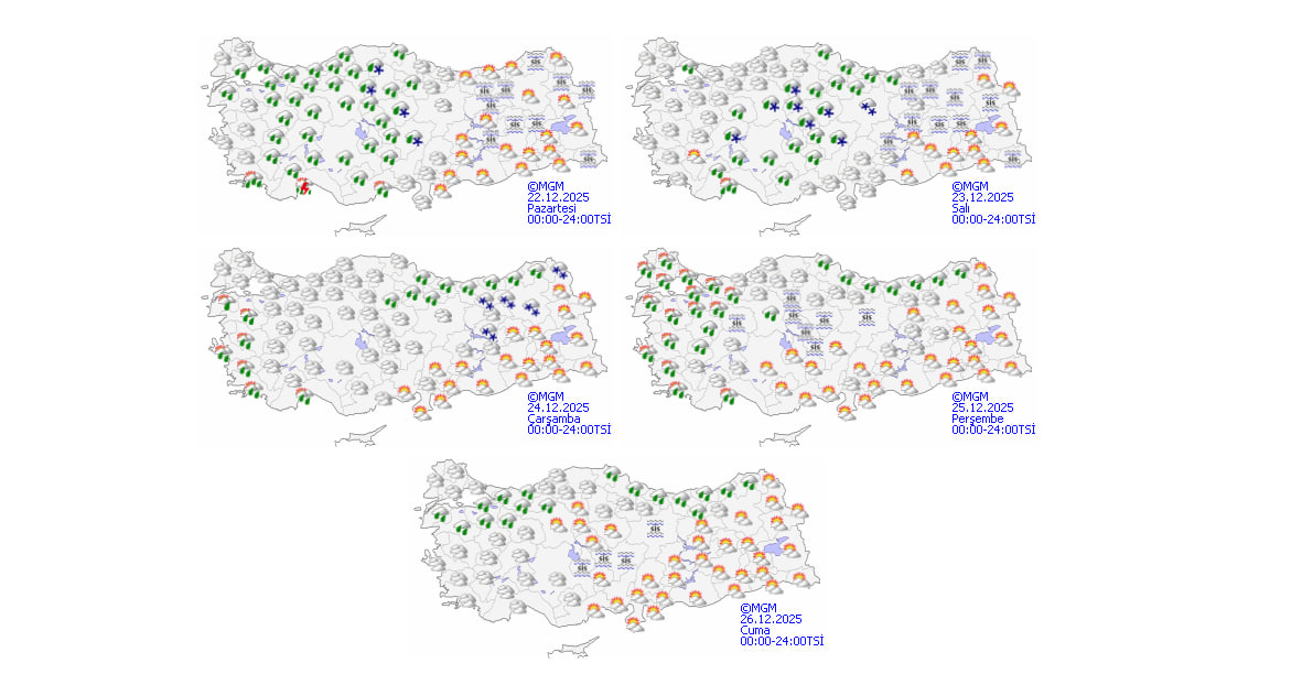 Meteoroloji Genel Müdürlüğü'nün son tahminlerine göre Türkiye genelinde parçalı ve yer yer çok bulutlu bir hava bekleniyor. Güney ve İç Ege, Batı Akdeniz, İç Anadolu, Batı ve Orta Karadeniz ile İstanbul, Kocaeli, Sakarya, Bilecik, Kırklareli'nin kıyı kesimleri ve Balıkesir'in kuzeyinde aralıklı yağışların etkili olacağı öngörülüyor.