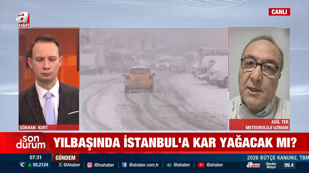 A Haber canlı yayınına katılan Meteoroloji Uzmanı Adil Tek, yılbaşı haftasına ilişkin kar beklentisini ve yurt genelindeki yağış tablosunu değerlendirdi. Açıklamalar, özellikle İstanbul için belirsiz ama dikkatle izlenmesi gereken bir sürece işaret ediyor.