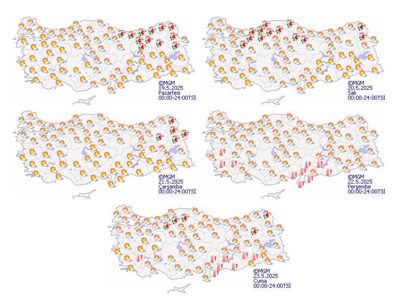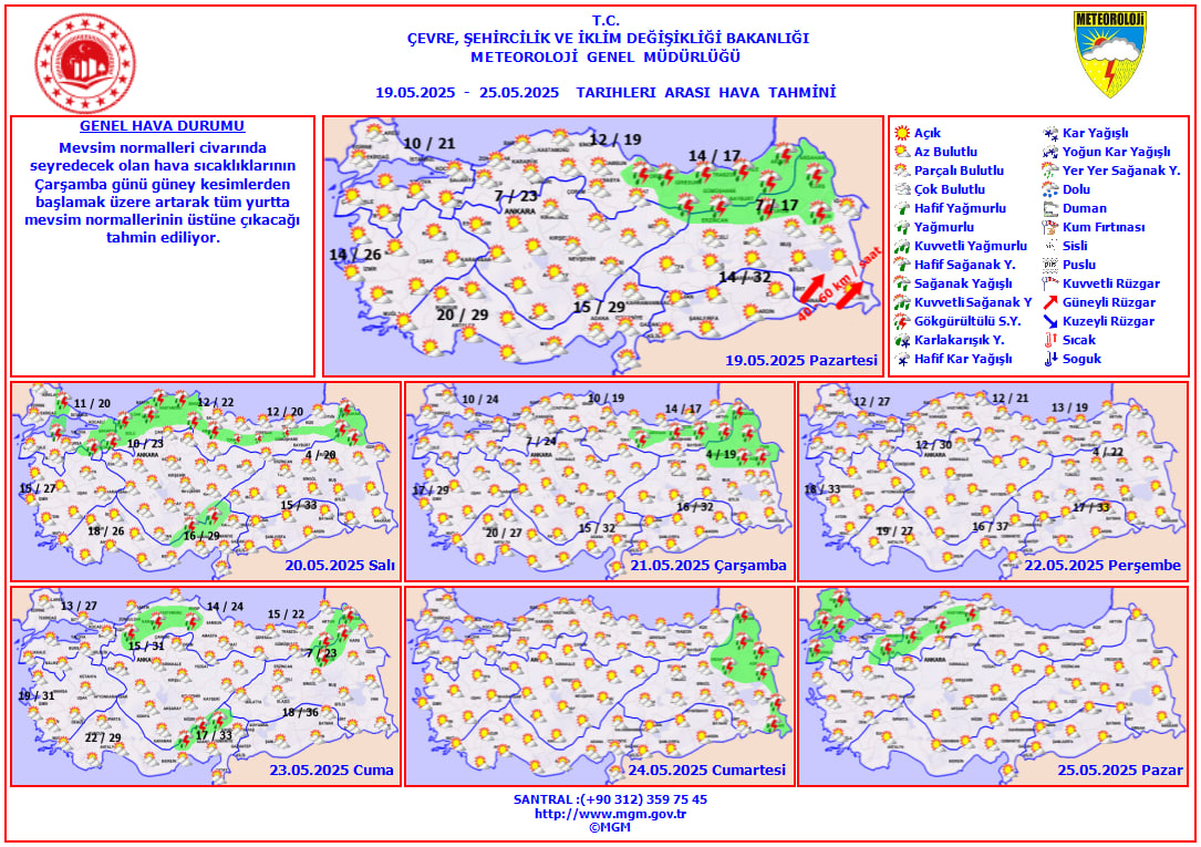 Meteoroloji Genel Müdürlüğü'nün yayımladığı hava tahmin raporuna göre Türkiye önümüzdeki hafta sıcaklık değişimlerinin etkisi altında olacak. Başlangıçta sıcaklıkların mevsim normallerinde seyretmesi beklenirken hafta ortasından itibaren önemli bir ısınma dalgası yaşanacak. Peki bu hafta hava nasıl olacak? İşte 19 Mayıs bölge bölge hava durumu tahminleri.