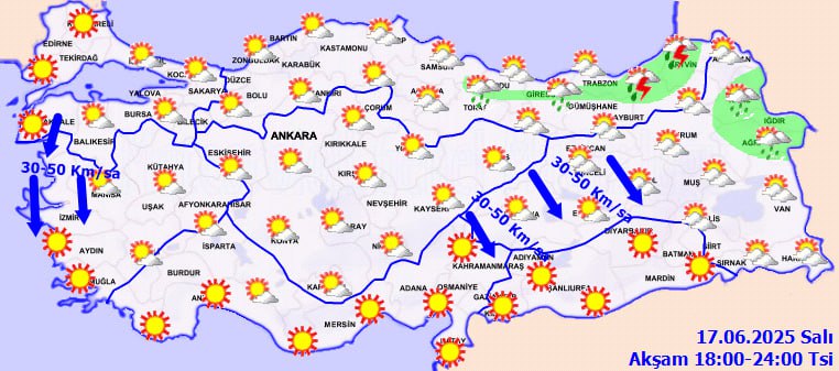 Kuzey Ege kıyıları, İç Anadolu'nun doğusu ve Doğu Anadolu'nun batısında kuzeyli yönlerden, Doğu Anadolu'nun güneydoğusunda ise güneyli yönlerden kuvvetli rüzgar (30-50 km/saat) bekleniyor. Meteoroloji, bu bölgelerde yaşanabilecek çatı uçması, ağaç devrilmesi ve ulaşımda aksamalara karşı vatandaşları tedbirli olmaları konusunda uyardı.