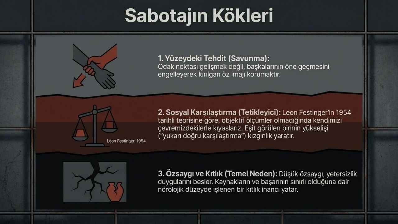 National Library of Medicine platformunda yer alan Özgüven Eksikliği ile Psikiyatrik Tanı Arasındaki İlişki makalesine göre bu davranış kalıbı çoğu zaman yetersizlik hissiyle bağlantılı gelişiyor. Kendi değerini sağlam bir zeminde kuramayan kişiler, çevresindeki insanların ilerlemesini kişisel eksikliklerinin görünür hale gelmesi gibi algılayabiliyor. Buna bir de fırsatların sınırlı olduğu inancı eklendiğinde rekabet daha sert, daha savunmacı ve daha yıkıcı hale geliyor. Böylece kişi kendi gelişimine odaklanmak yerine başkasının yükselişini durdurmaya yöneliyor.