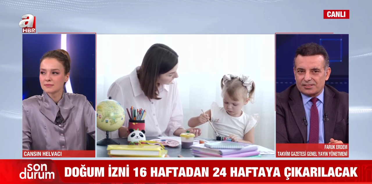 A Haber canlı yayınında konuşan Faruk Erdem, mevcut doğum izni süresinin artırılacağını belirtti. Düzenlemenin hem memur hem de işçi anneleri kapsadığını vurguladı. 16 haftalık olan doğum izni 24 haftaya çıkarılacak. Çalışan anneler bu izin süresinin 3 ayını doğumdan önce, 3 ayını da doğumdan sonra kullanabilecekler.