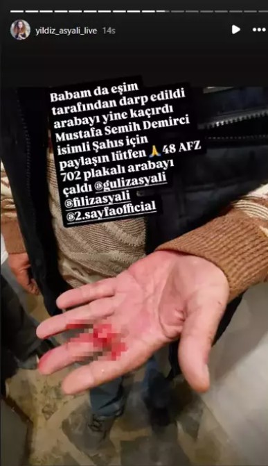 Asyalı, bu kez eşinin, babası Ümit Asyalı'yı darbettiğini söyledi. Ünlü isim, "Babam da eşim tarafından darbedildi, arabayı yine kaçırdı. Mustafa Semih Demirci isimli şahıs için paylaşın lütfen" diyerek takipçilerinden ve yetkililerden yardım istedi.