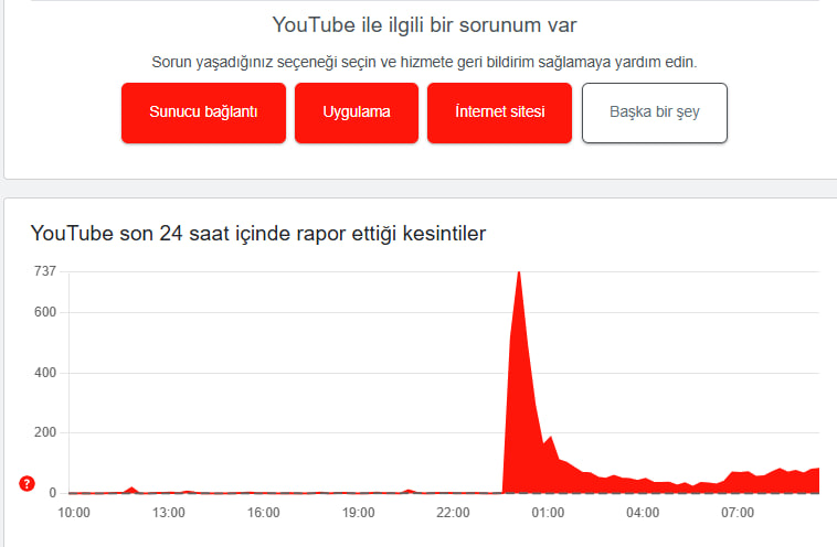 Gece 00:00 ile 01:00 arasında kullanıcı raporları zirve yaptı. Sabah saatlerine doğru azalma gözlense de, hâlâ bazı kullanıcılar YouTube'a erişimde sorun yaşamaya devam ediyor. Platform üzerinden video izlemeye çalışanlar, yükleme hataları ve bağlantı problemleriyle karşılaştıklarını belirtiyor.