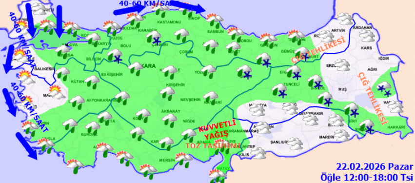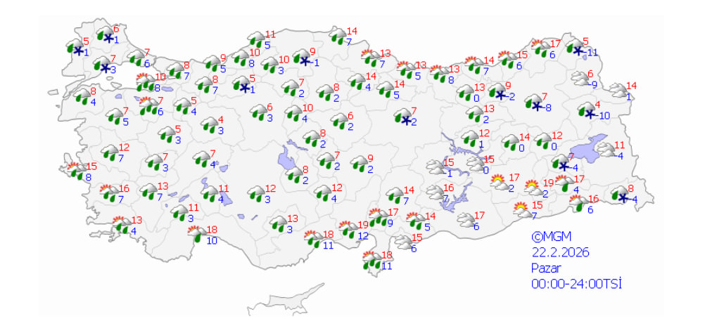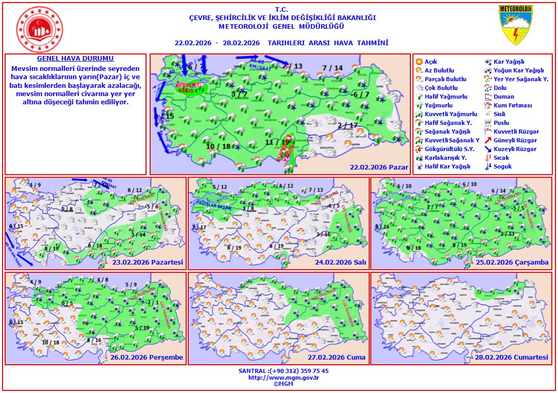 Meteoroloji Genel Müdürlüğü'nün 22 Şubat Pazar gününe ilişkin raporu, yurt genelinde hareketli bir hava tablosuna işaret ediyor. Buna göre Türkiye'nin büyük bölümünde parçalı ve çok bulutlu bir gökyüzü hakim olacak, birçok bölgede ise aralıklı yağış görülecek.