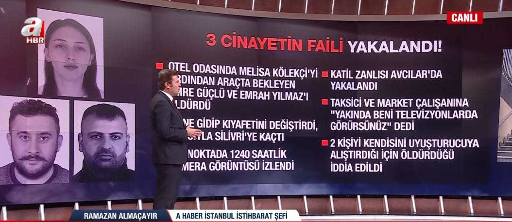 Asayiş Şube Müdürlüğü Cinayet Büro Amirliği ekipleri, Mimar Sinan Mahallesi'nde 10 Kasım'da otel odasındaki Melisa Külekçi (27) ile yaklaşık 20 metre ilerideki D-100 kara yolu yan yoldaki otomobilde Emre Güçlü (31) ve Emrah Yılmaz'ı (33) silahla öldürdüğü iddia edilen şüphelinin yakalanmasına yönelik çalışma yaptı.
