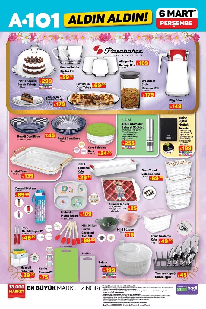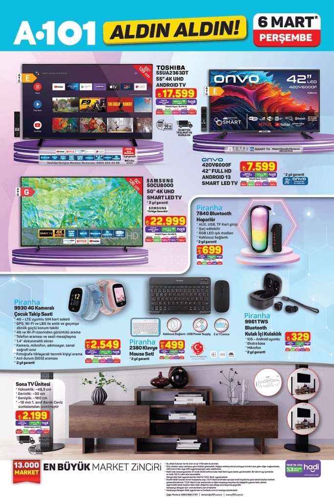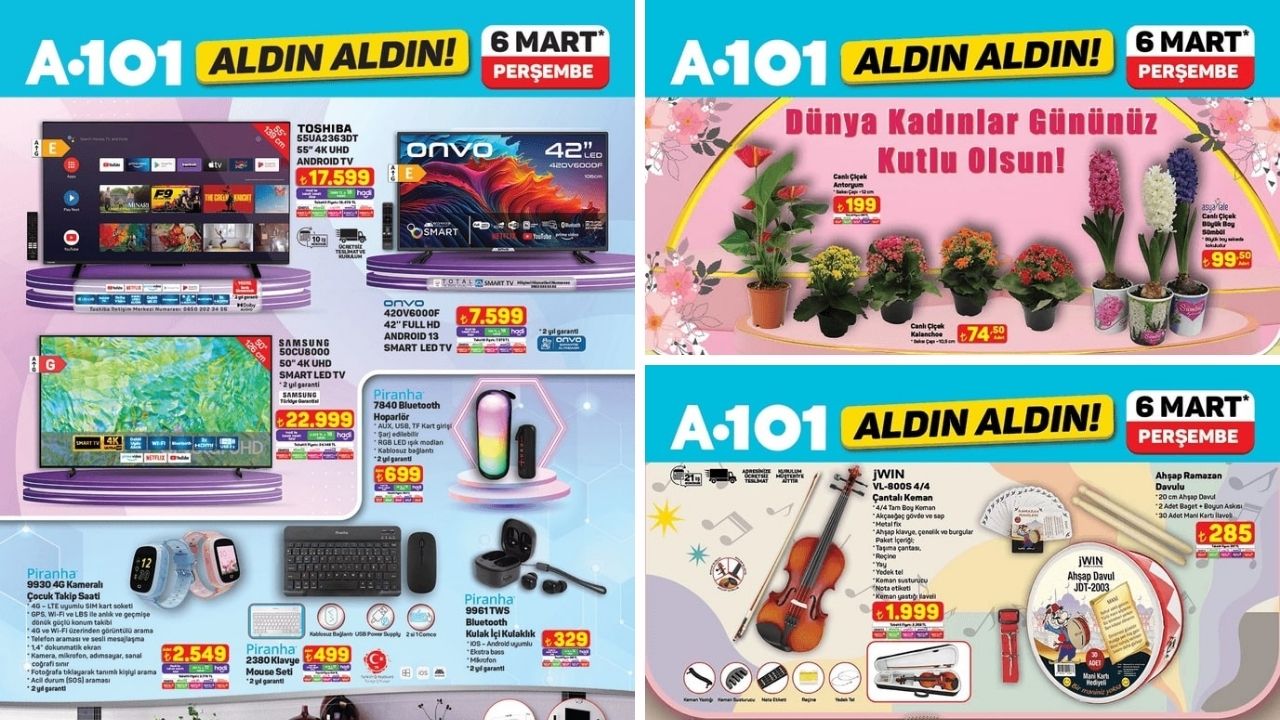 A101 6 Mart aktüel kataloğuyla bu hafta da cazip indirimler sunuyor. Buharlı ütü, aspiratör, klavye-mouse seti, kameralı çocuk takip saati, TV ünitesi ve daha birçok ürün avantajlı fiyatlarla raflarda yerini alacak. İşte A101 Aldın Aldın fırsatları ve ürün fiyatları…