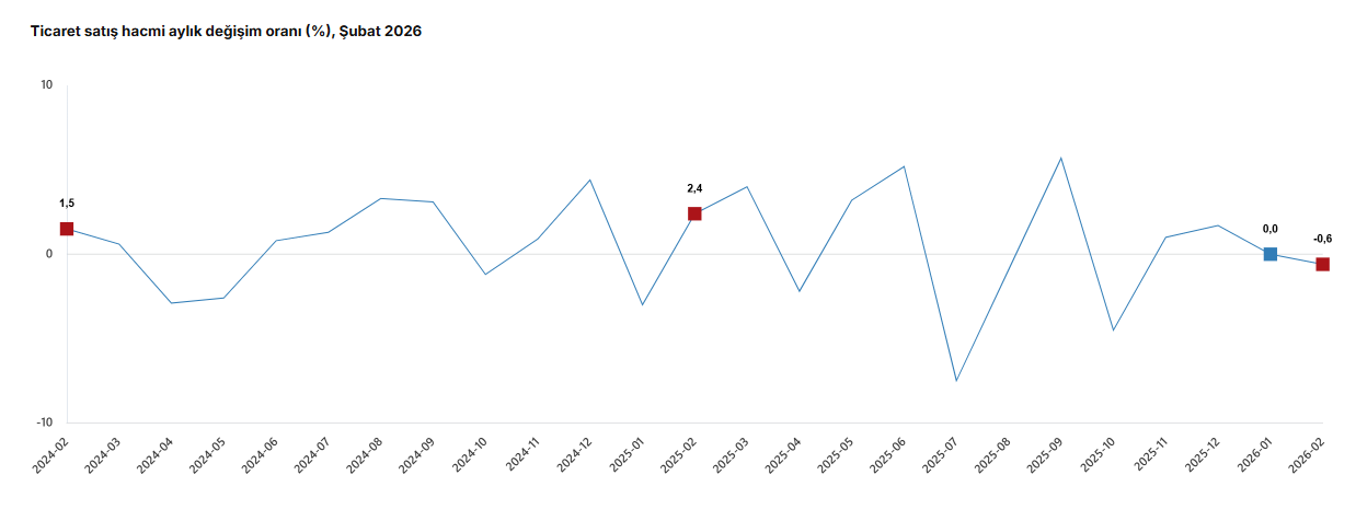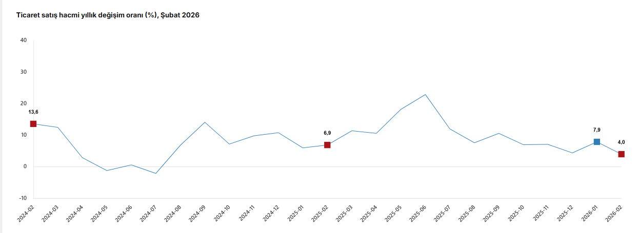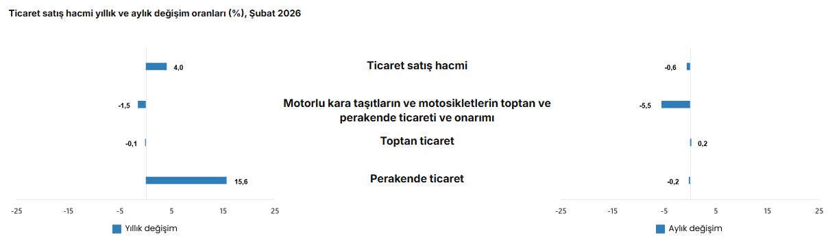 TÜİK tarafından açıklanan verilere göre, Türkiye'nin toplam ticaret satış hacmi Şubat ayında geçen yılın aynı ayına kıyasla yüzde 4 arttı. Aylık bazda ise bir önceki aya göre yüzde 0,6 oranında düşüş kaydedildi.