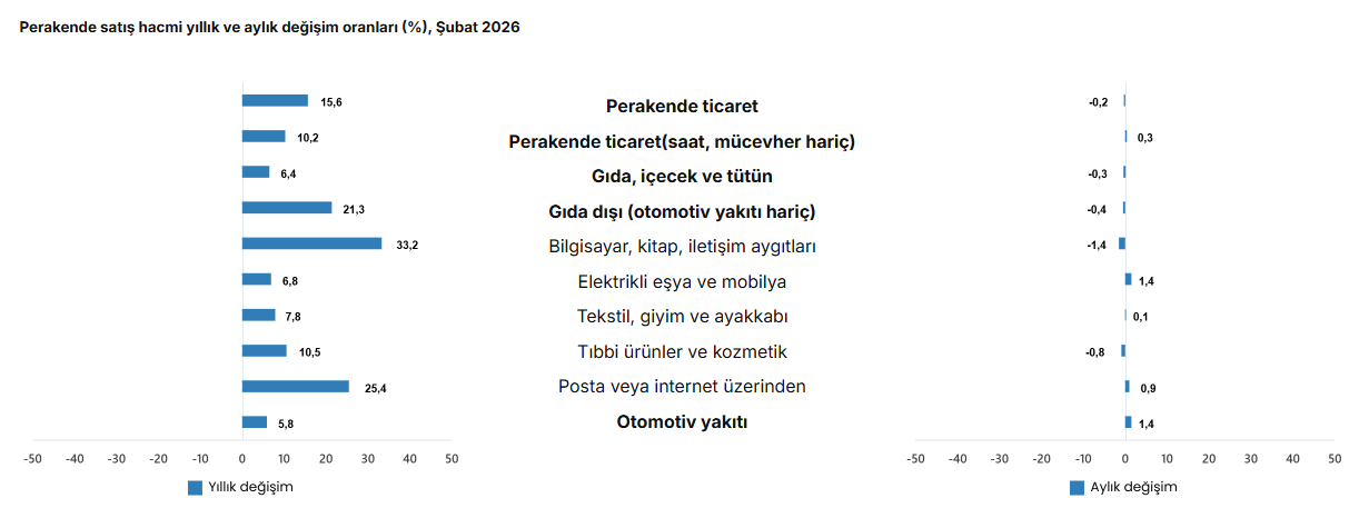 Şubat ayının en dikkat çeken verisi perakende ticaret kanadında görüldü. Perakende ticaret satış hacmi, yıllık bazda yüzde 15,6 artış gösterdi. Aylık bazda ise Ocak ayına göre yüzde 0,2'lik bir azalış kaydedildi.