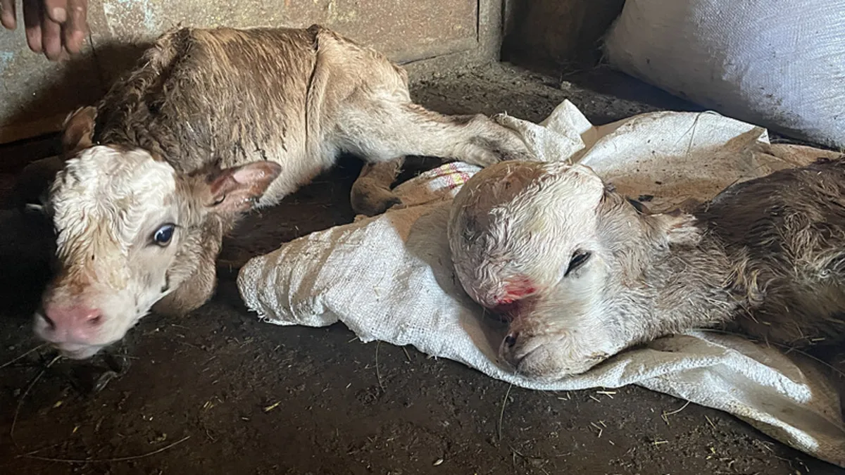 Kars'ın Susuz ilçesinde bir besicinin doğum yapan ineğinin ikiz buzağılarından birinin baş kısmının büyük ve öne doğru eğik olması görenleri şaşırttı.