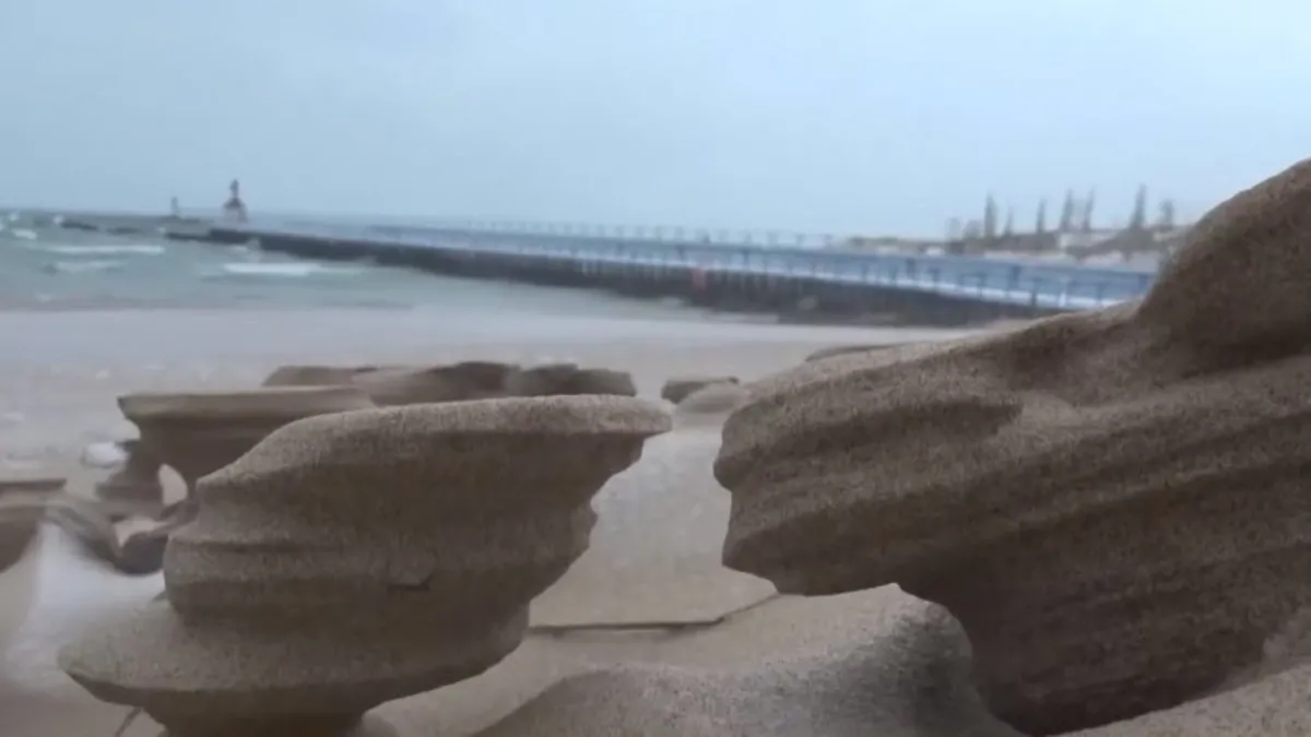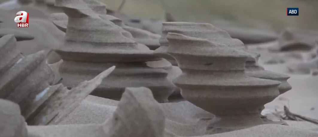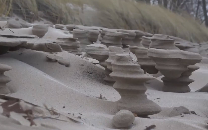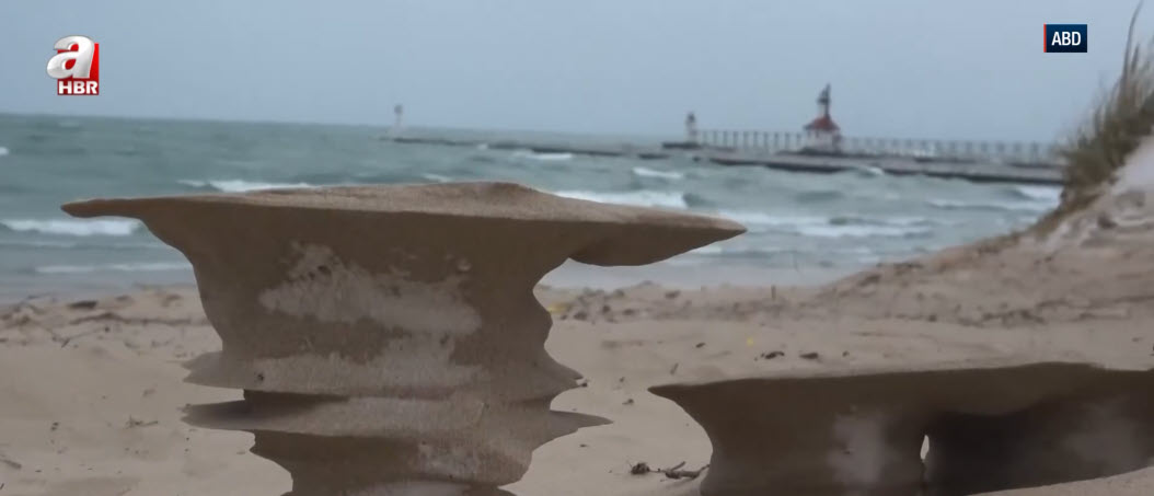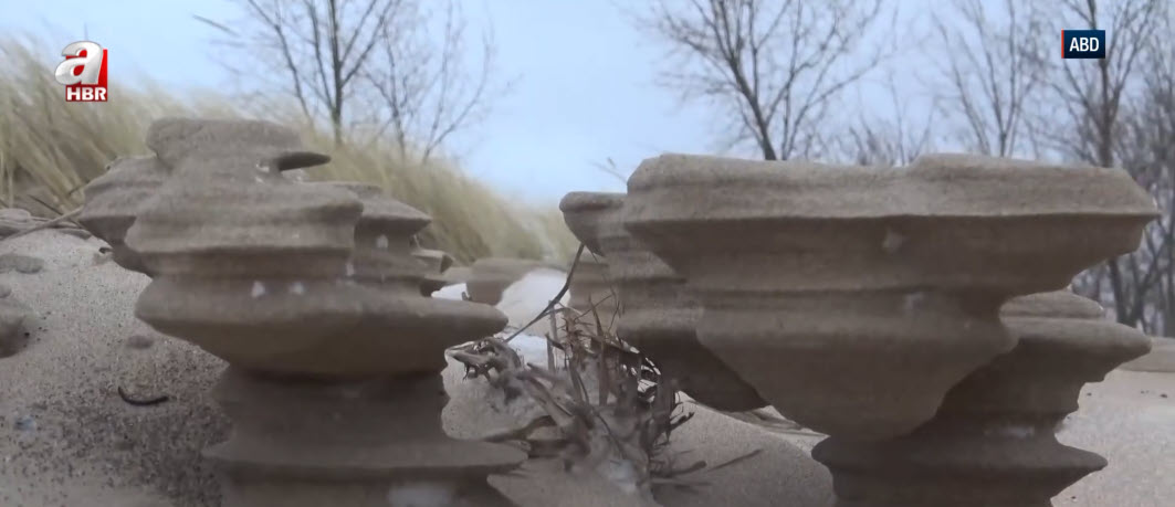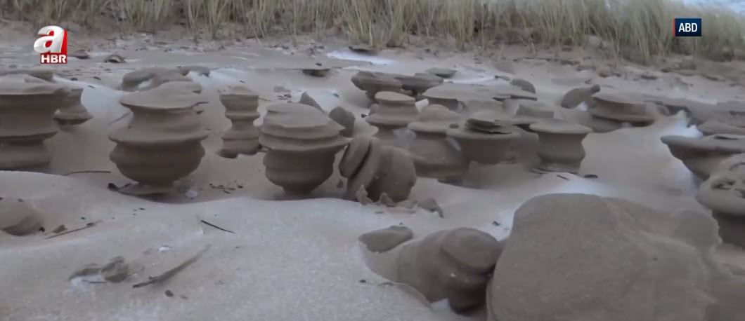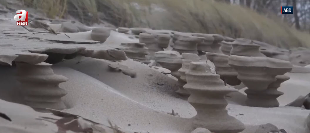 Göl kıyısında ortaya çıkan ve satranç taşlarını andıran gizemli kum şekilleri görenleri hayrete düşürüyor. İşte yalnızca yılın en soğuk günlerinde beliren o nadir oluşumların nedeni...
