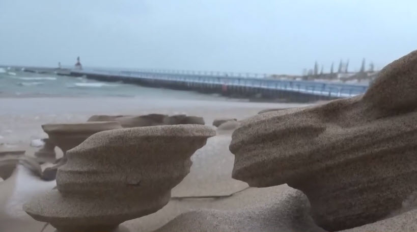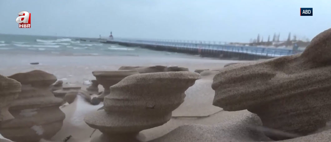 Sahilde etkili olan sert rüzgar kumları dondurarak birbirinden ilginç heykel görünümünde şekiller oluşturdu.