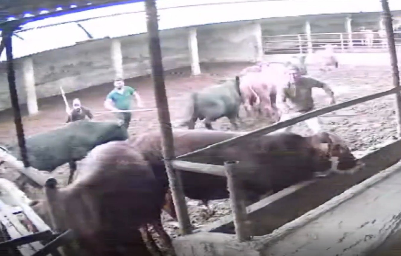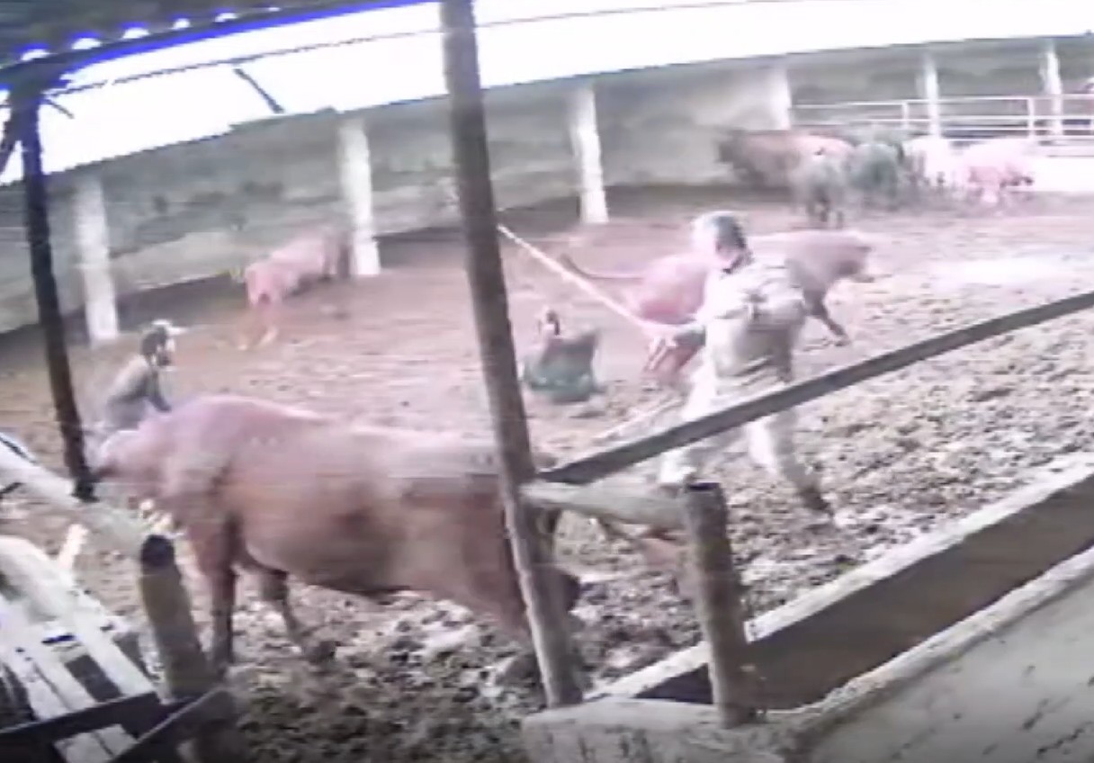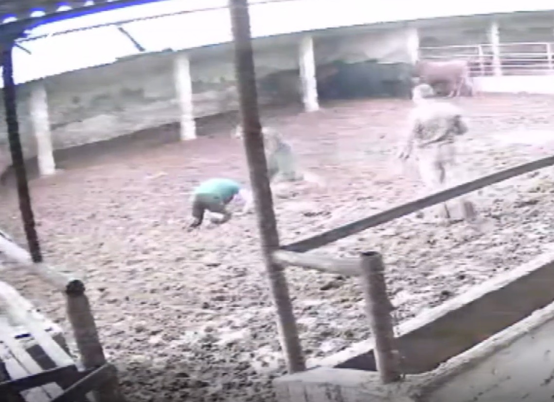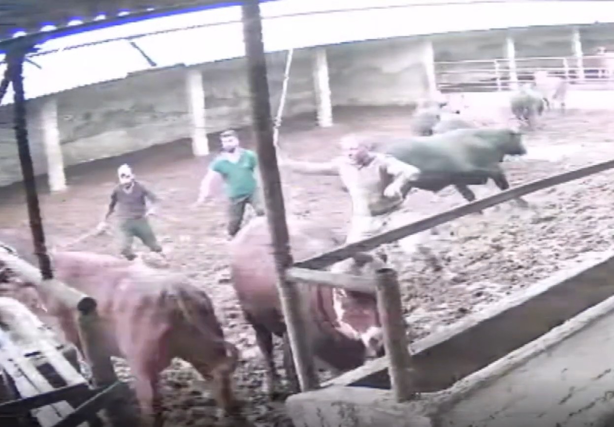 Besicilerin hayvanları bir araya toplamaya çalıştığı sırada, bir boğa aniden besicinin üzerine doğru zıpladı.