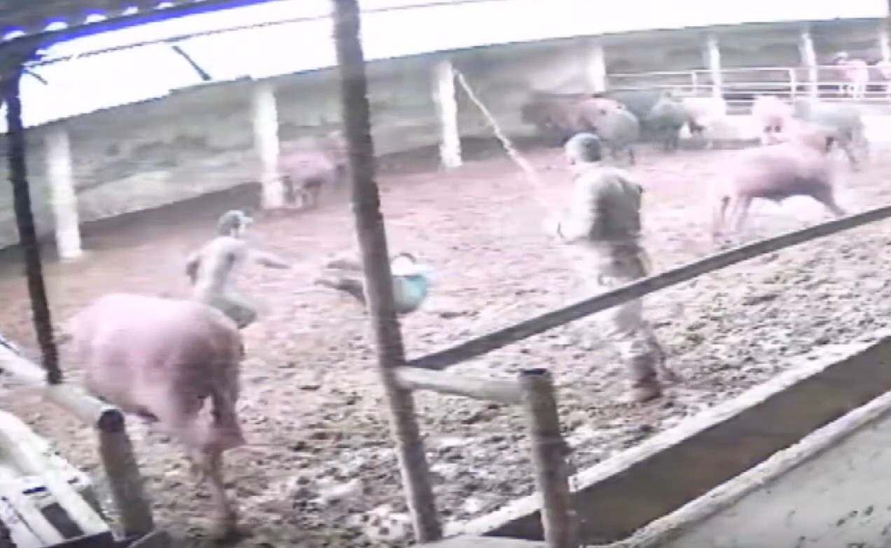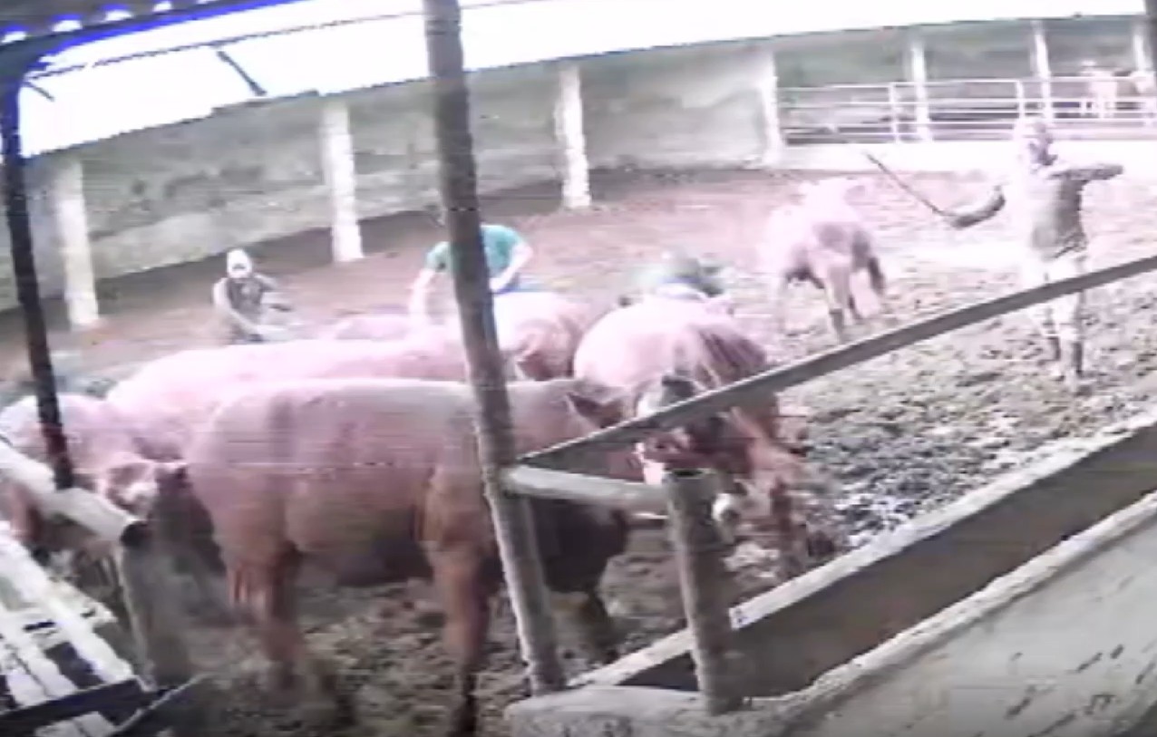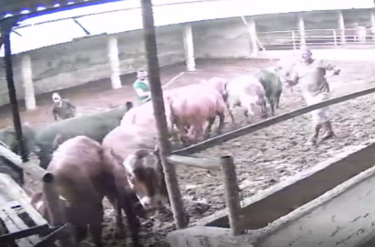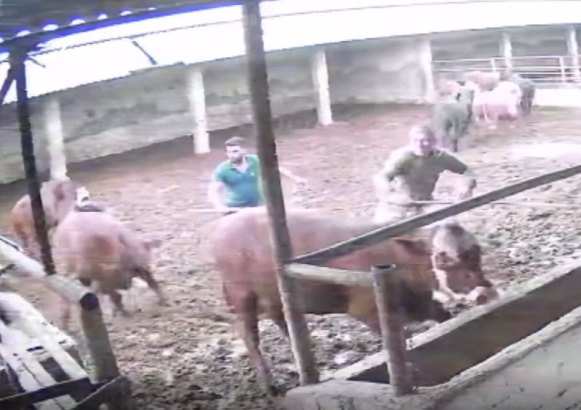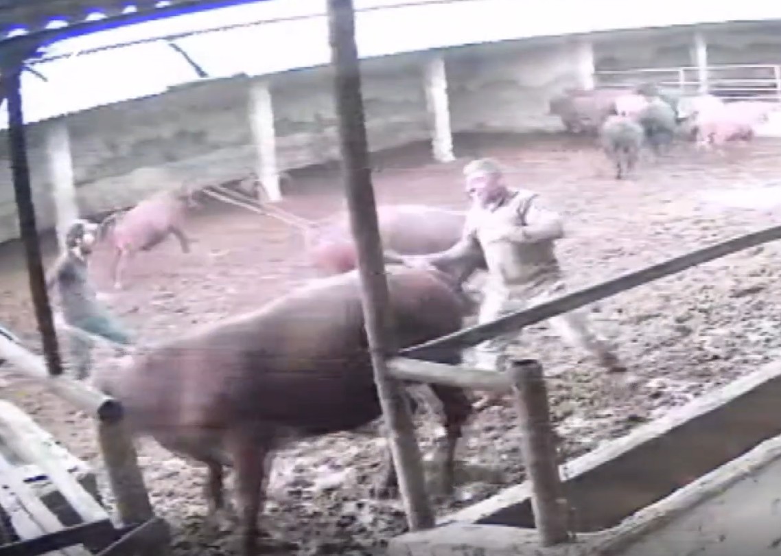 Besicilerin hayvanları bir araya toplamaya çalıştığı sırada, bir boğa aniden besicinin üzerine doğru zıpladı.