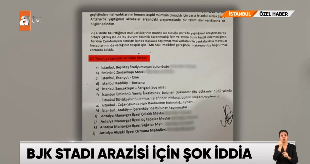 ATV'den Özlem Aktay'ın özel haberine göre 24 Haziran 2024 tarihinde açılan davada aile Beşiktaş Tüpraş Stadyumu'nun arazisi "bize ait" diyerek hak talep etti.