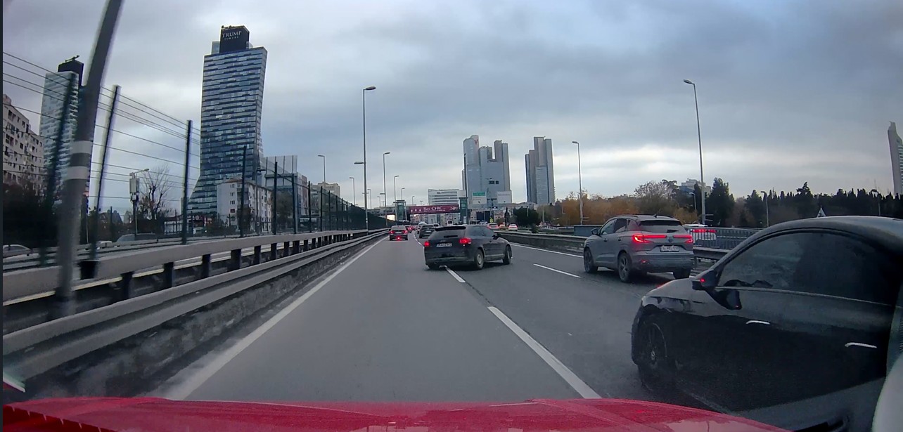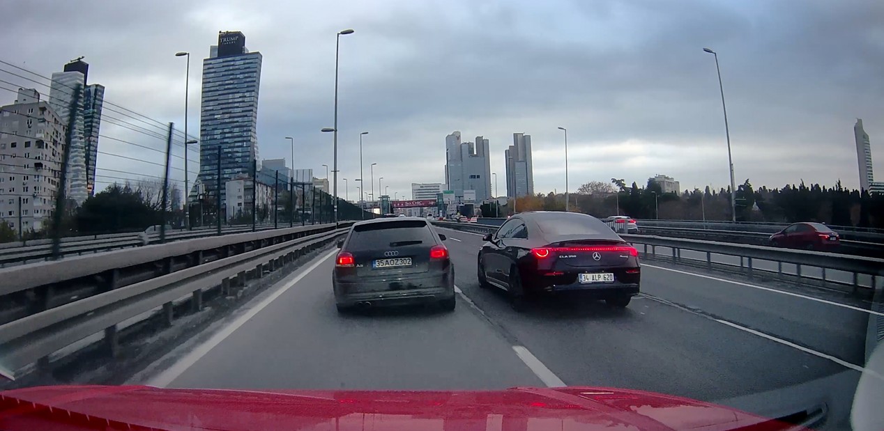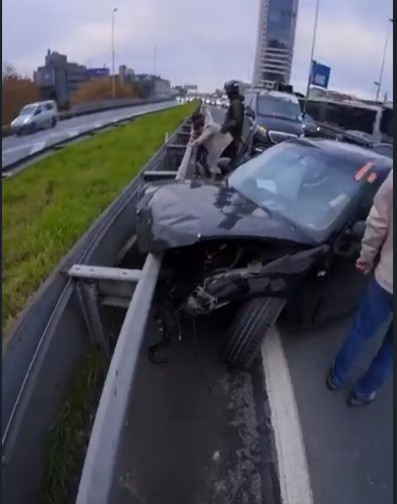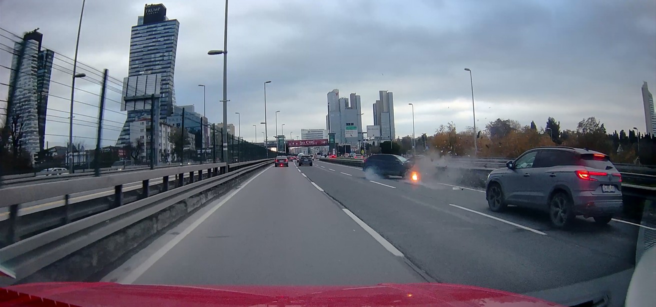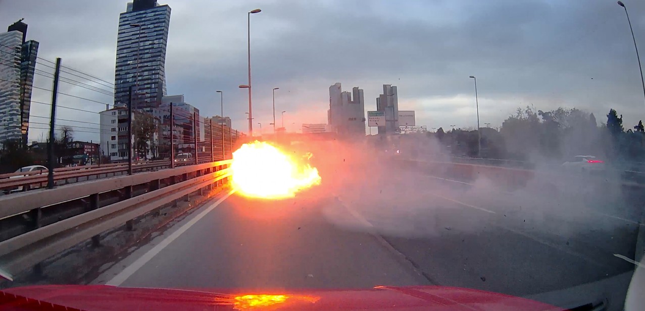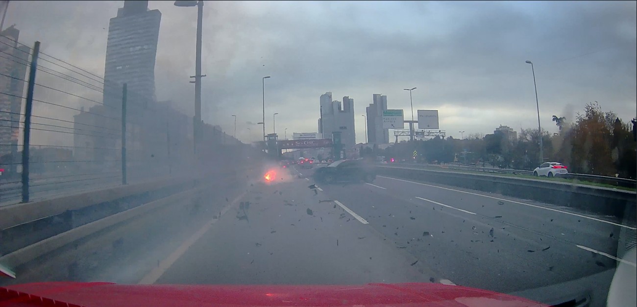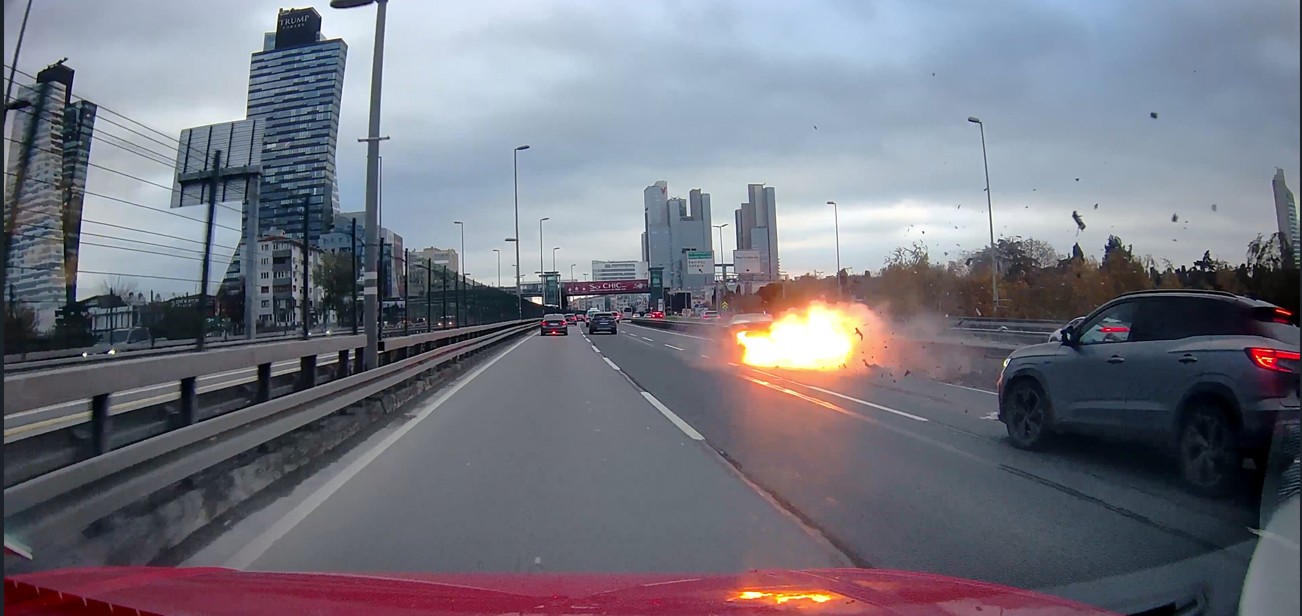 Şişli Mecidiyeköy D-100 Karayolu'nda makas atan bir sürücü, direksiyon hakimiyetini kaybederek bariyerlere çarptı. Çarpmanın ardından otomobil alev alırken, patlamayla kopan motor yola fırladı. Dehşet anları araç kamerasına saniye saniye yansıdı.