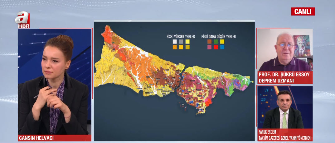 A Haber Spikeri Helvacı, Prof. Dr. Şükrü Ersoy'a "Bu büyük İstanbul depremi miydi? Hala risk altında mıyız? Değerli hocalarımız aynı verilere bakıp nasıl bu kadar uç noktalarda? Neden bir araya gelemiyorsunuz? Merak ediyorum." sorularını yöneltti.