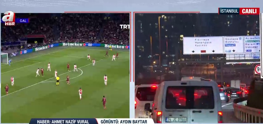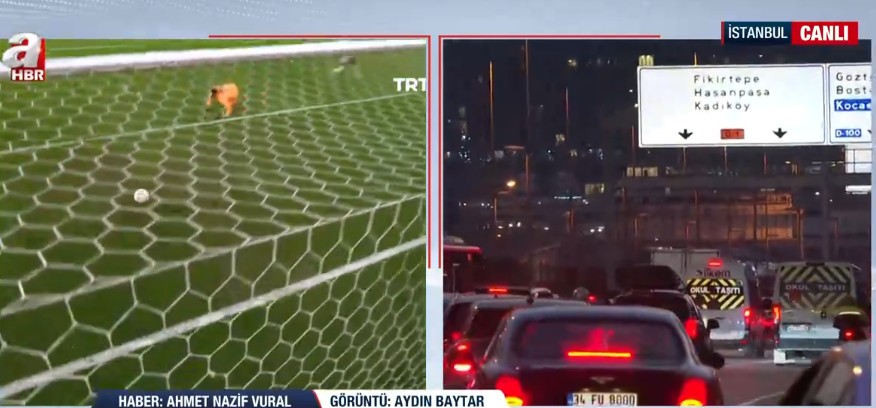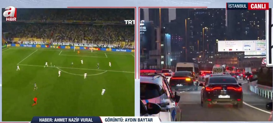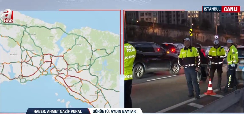 İstanbul trafiği bugün mesai saatlerinin sona ermesiyle birlikte %80 barajını bir kez daha aştığını belirten A Haber Muhabiri Ahmet Nazif Vural, trafiğin an itibarıyla %85 civarlarında seyrettiğini söyledi. Anadolu Yakası'ndaki bu oranın %90'a ulaştığını belirten Vural, Avrupa Yakası'ndaki durumun %81 civarlarında seyrettiğini belirterek yağmur ve Fenerbahçe-Galatasaray derbisiyle oluşan trafiğe ilişkin şu ifadeleri kullandı: