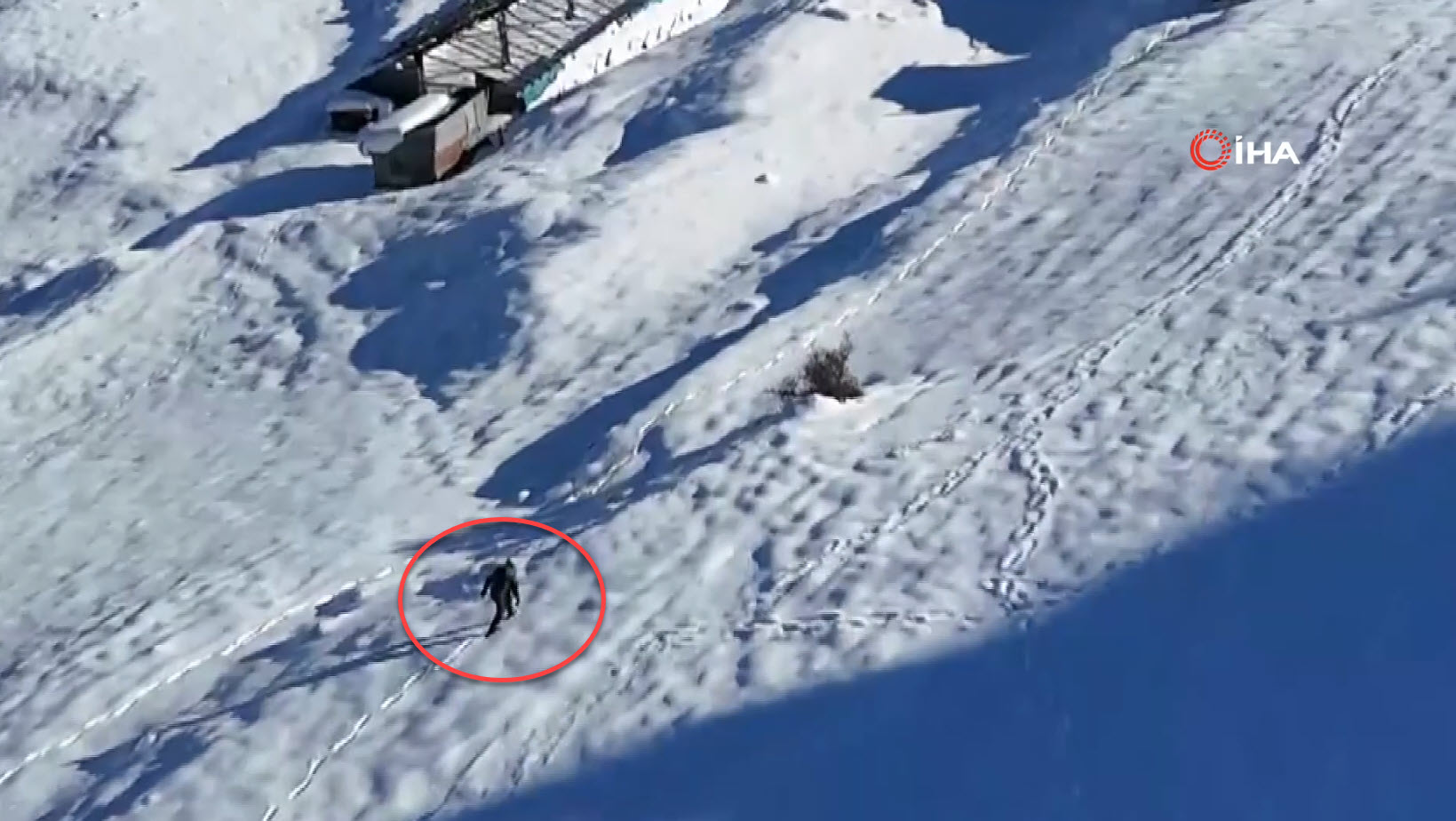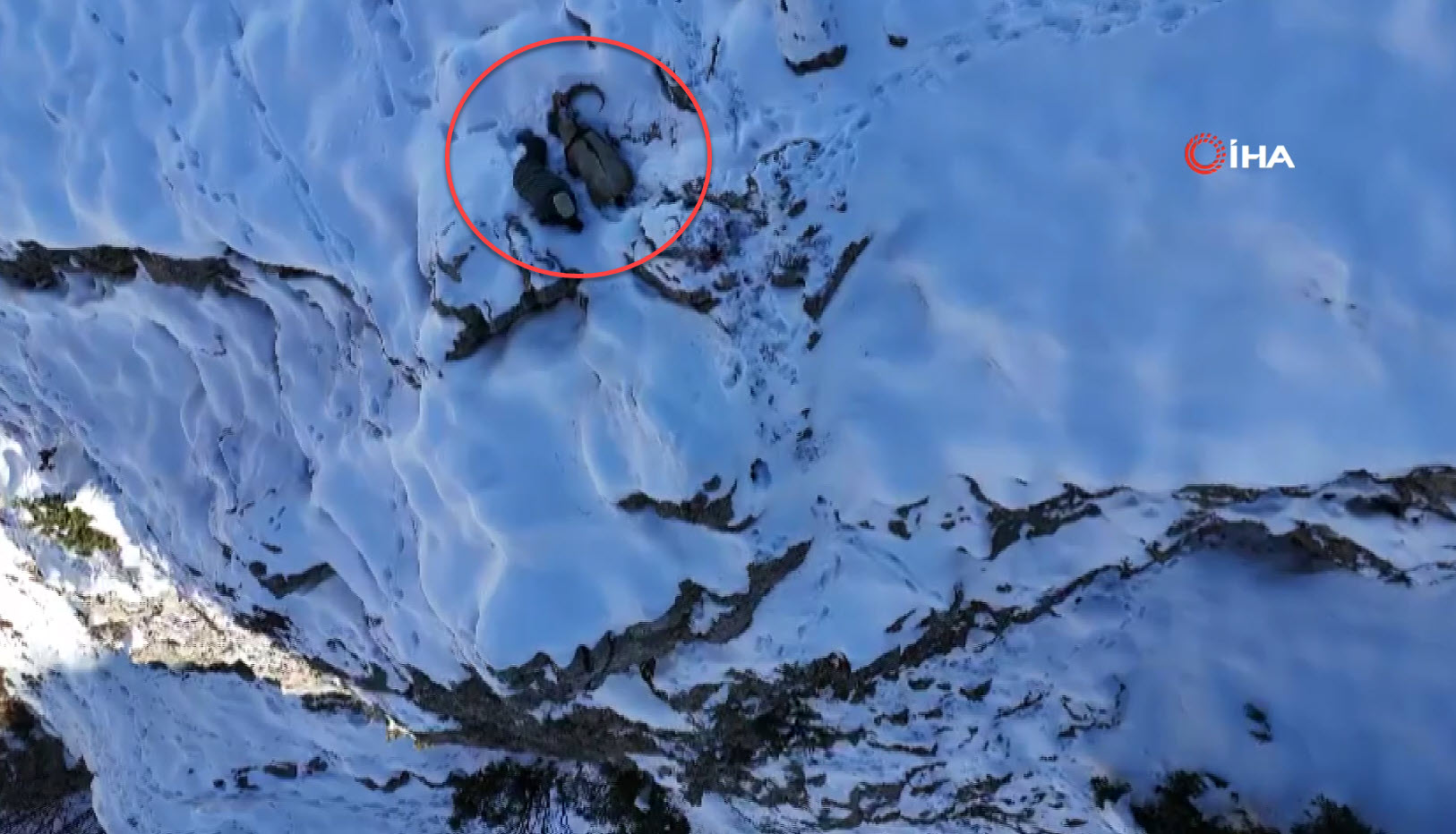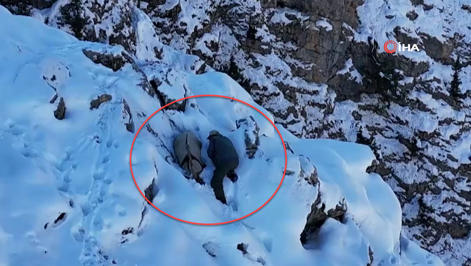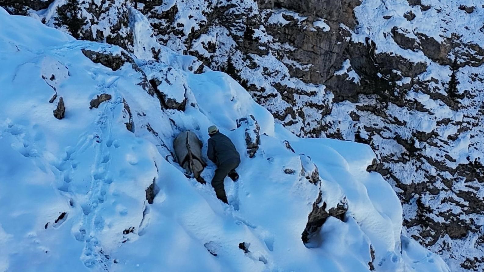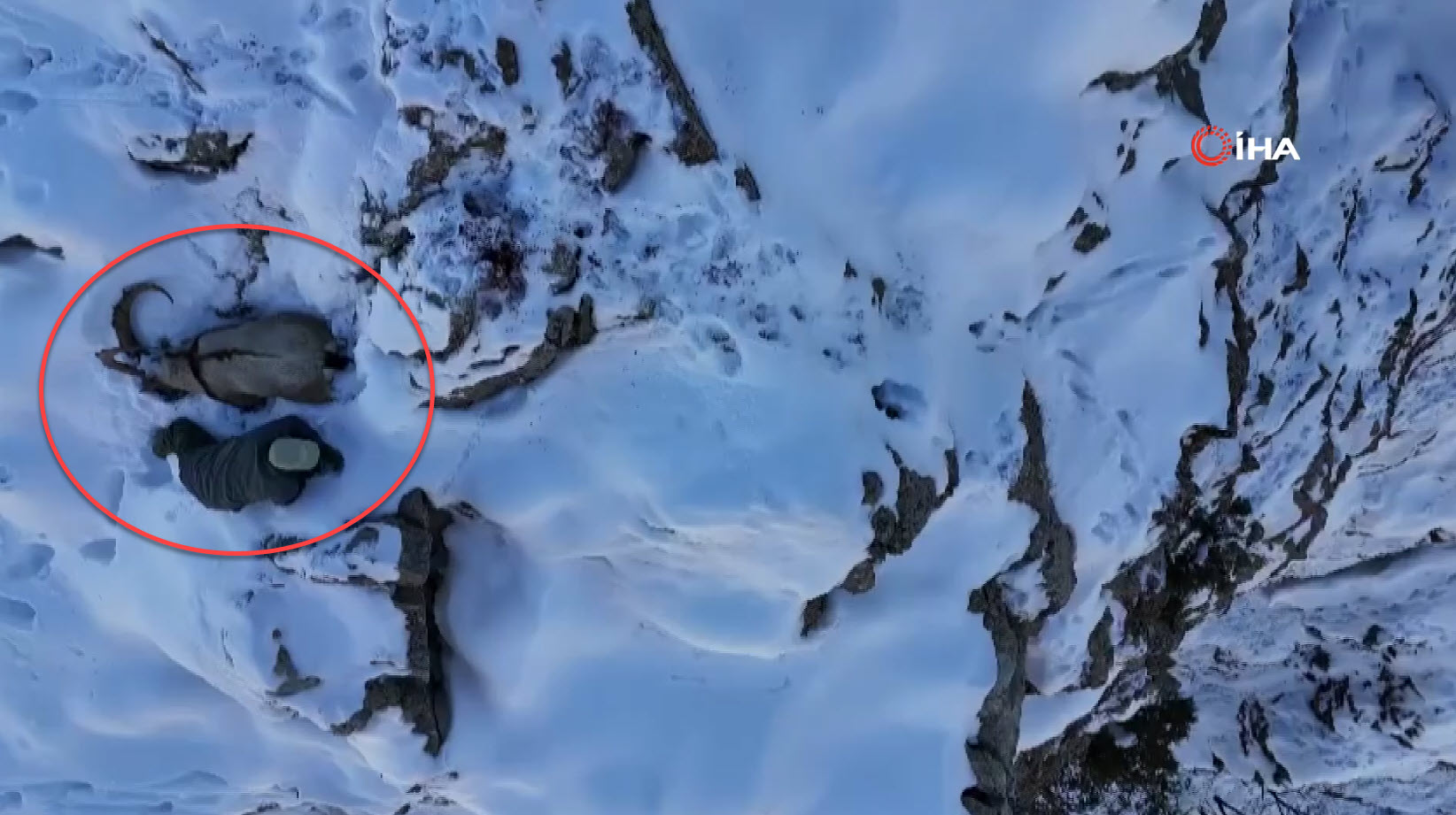 Bir süre dağ keçisinin yanında hareketsiz halde duran kişi, daha sonra karlı arazide izini kaybettirmeye çalıştı.