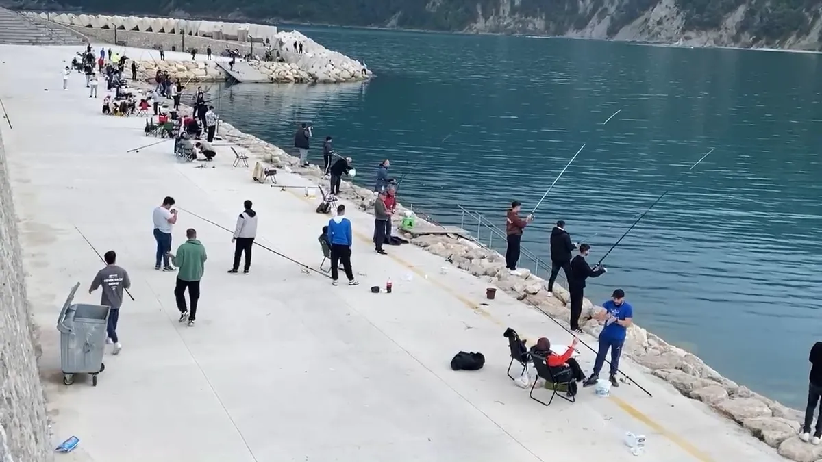Bartın'ın Amasra ilçesinde limana balık sürüsünün girdiğini duyan mendireğe akın etti. Sabahın ilk ışıklarında oltasını kapan kadın, erkek herkes balık avladı.