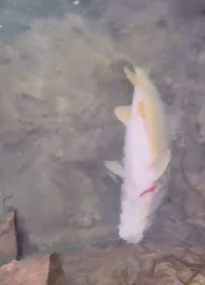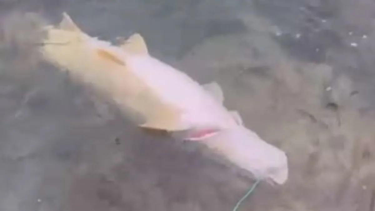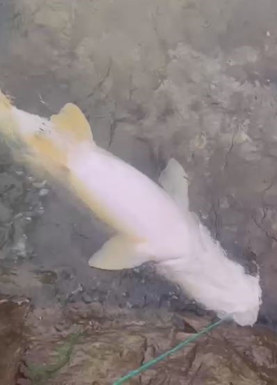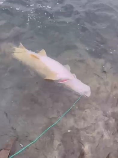 Yakaladığı dev Fırat turnasını ip yardımıyla karaya çeken Şimşek, balığın büyüklüğünü görünce verdiği tepki ise gündem oldu.
