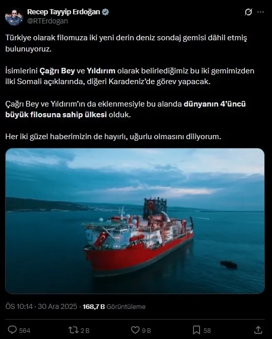 Erdoğan X hesabından yaptığı paylaşımda şu ifadelere yer verdi: "Türkiye olarak filomuza iki yeni derin deniz sondaj gemisi dâhil etmiş bulunuyoruz. İsimlerini Çağrı Bey ve Yıldırım olarak belirlediğimiz bu iki gemimizden ilki Somali açıklarında, diğeri Karadeniz'de görev yapacak. Çağrı Bey ve Yıldırım'ın da eklenmesiyle bu alanda dünyanın 4'üncü büyük filosuna sahip ülkesi olduk. Her iki güzel haberimizin de hayırlı, uğurlu olmasını diliyorum."