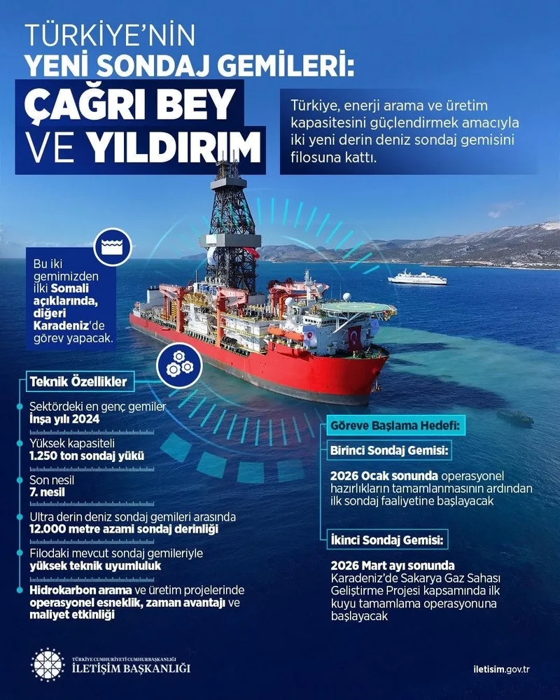 Başkan Recep Tayyip Erdoğan tarafından duyurulan "Çağrı Bey" ve "Yıldırım" isimli iki yeni derin deniz sondaj gemisinin filoya katılmasıyla, Türkiye yalnızca Karadeniz'de değil, Afrika açıklarında da fiilî enerji arama kapasitesine sahip bir ülke konumuna yükselecek.