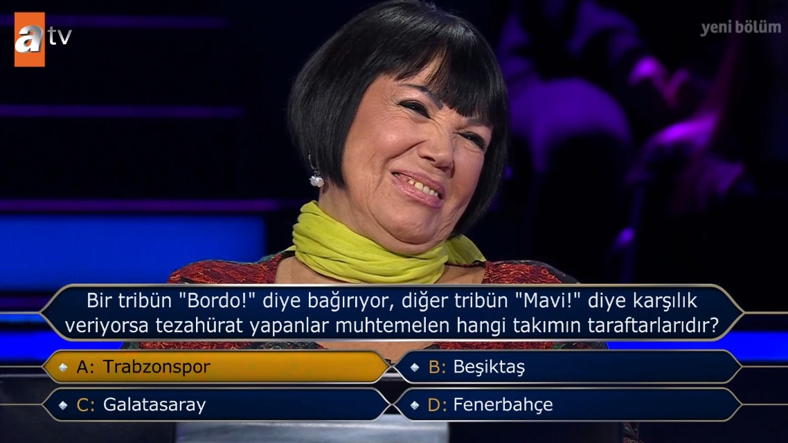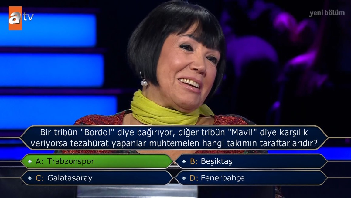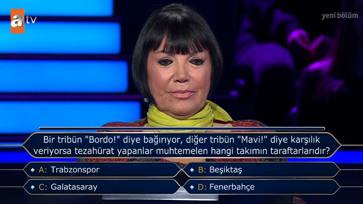 ATV'nin en sevilen ve en çok kazandıran programlarından biri olan Kim Milyoner Olmak İster her hafta olduğu gibi bu hafta da izleyenleri ekran başına kilitledi. Programda bu kez Galatasaraylıları yakından ilgilendiren bir soru yarışmanın ön plana çıkan sorularından biri oldu. Galatasaray sorusu futbolseverleri ekrana kilitlerken yarışmacının verdiği cevap ise şaşırttı. İşte o anlar ve programda yaşananlar...