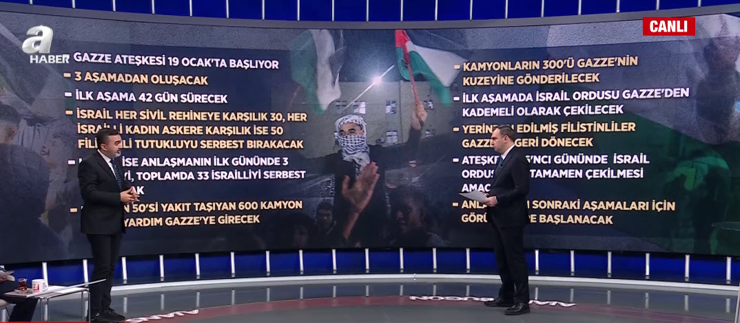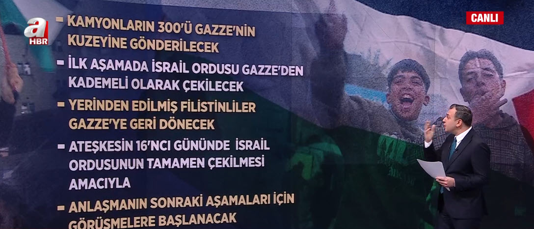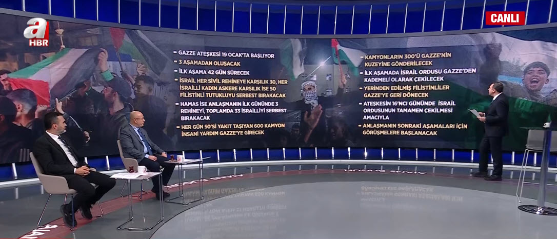 Katil İsrail ateşkes şartlarına uyacak mı? İsrail Gazze'den ne zaman çekilecek? Uzman isimler A Haber canlı yayınında konu ile ilgili değerlendirmelerde bulundu.