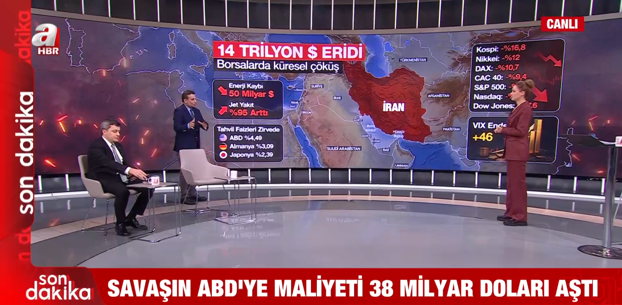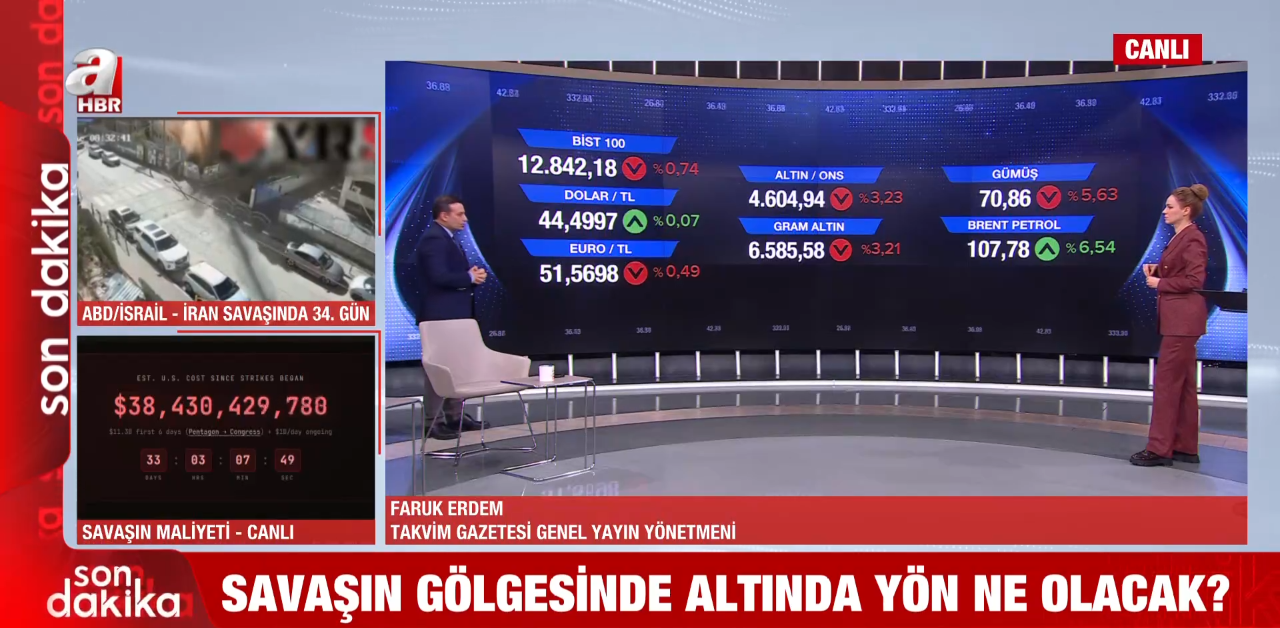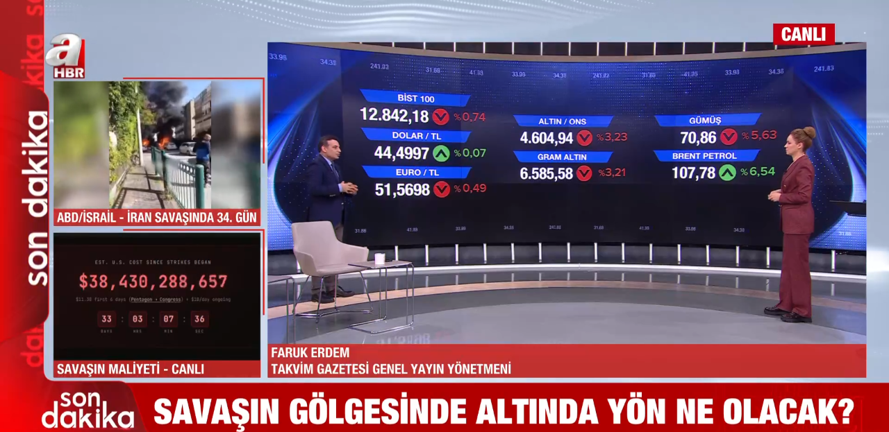 Takvim Gazetesi Genel Yayın Yönetmeni Faruk Erdem, A Haber canlı yayınında savaşın gölgesindeki altın fiyatlarını ve küresel piyasalardaki son durumu çarpıcı rakamlarla analiz etti. Erdem, "Siyonist katilin hezeyanlarıyla başlayan bu savaşın maliyeti sadece cepleri değil sosyal hayatı da vuruyor" diyerek tehlikenin boyutuna dikkat çekti.