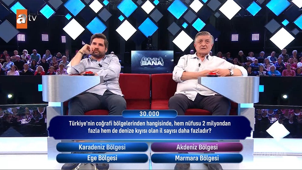 atv'nin sevilen yarışma programı Güven Bana, her Salı ve Perşembe akşamları seyircisini ekrana kilitlemeye devam ediyor. Müge Anlı'nın sunumuyla 19 Ağustos Salı akşamı yeni bölümüyle ekrana gelen Güven Bana'nın bu haftaki yarışmacılar, Ünlü oyuncu Ceyhun Fersoy ile Teknik Direktör Yılmaz Vural oldu. Birbirinden zorlu soruları büyük bir özveri ile cevaplayan Fersoy ve Vural, gecenin ilerleyen dakikalarında karşılarına çıkan "geometri" sorusunda fikir ayrılığı yaşaması eğlenceli anlara sahne oldu. Sevilen ünlü isimler soruya bakın nasıl yanıt verdi? İşte gece boyunca yaşananlar...
